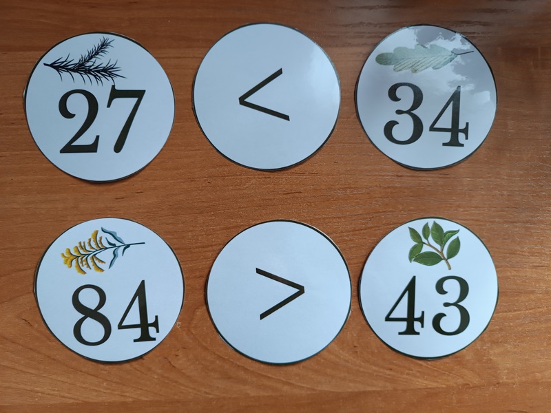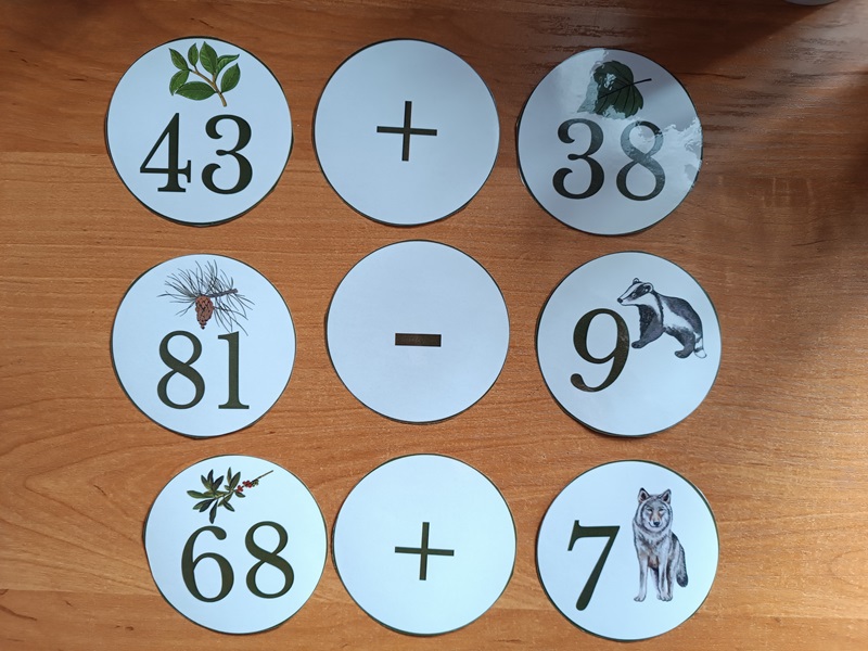 Součástí materiálu jsou i znaménka +, -, =, >, <, jednotlivé kartičky lze tak využít i k procvičování jiného učiva (sčítání, odčítání, porovnávání).