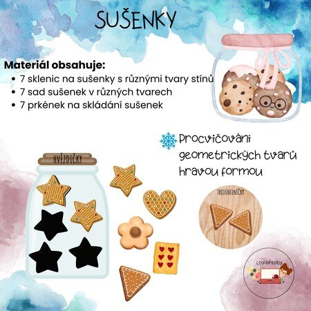 Děti přiřazují sušenky ke správným sklenicím podle stínů a trénují tak pozorování i přesnost. Pro starší nebo zkušenější skupiny je připravena i náročnější varianta: učitel přečte název tvaru a dítě vyhledá odpovídající sušenky a uloží je na prkénko. Jednoduchý princip, ale skvěle rozvíjí soustředění i jazykové dovednosti.