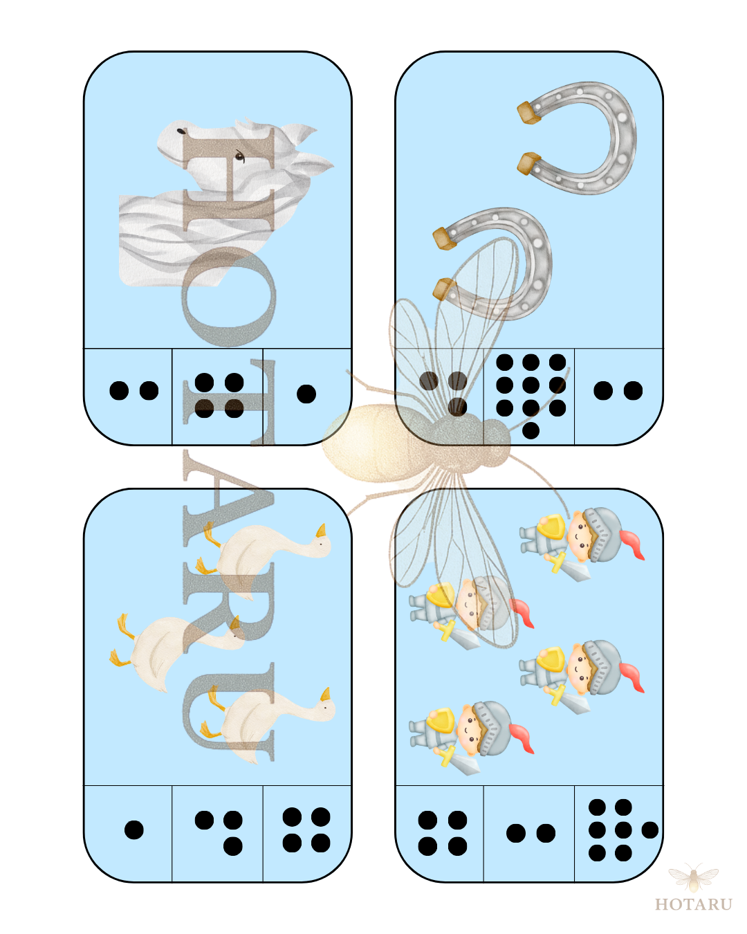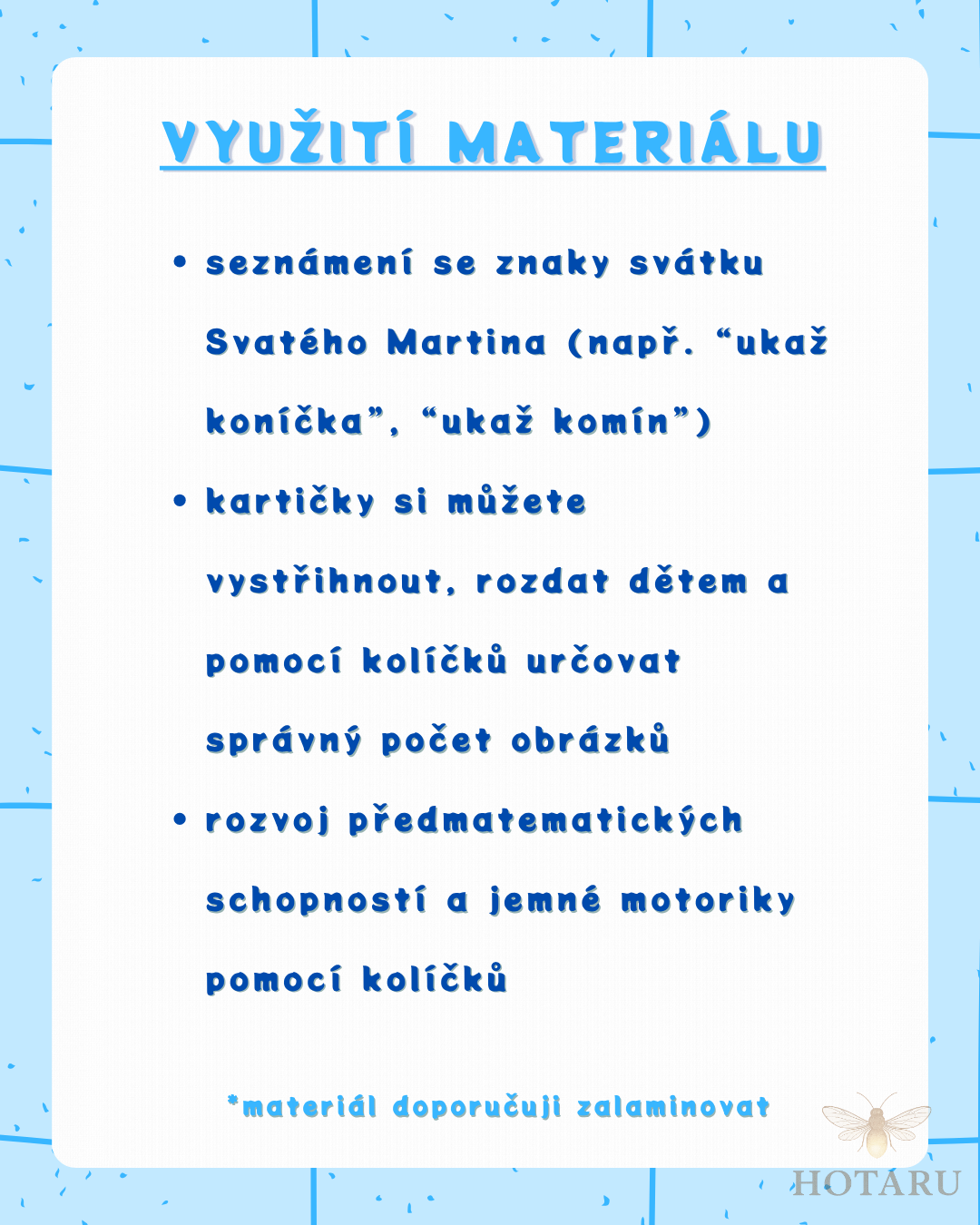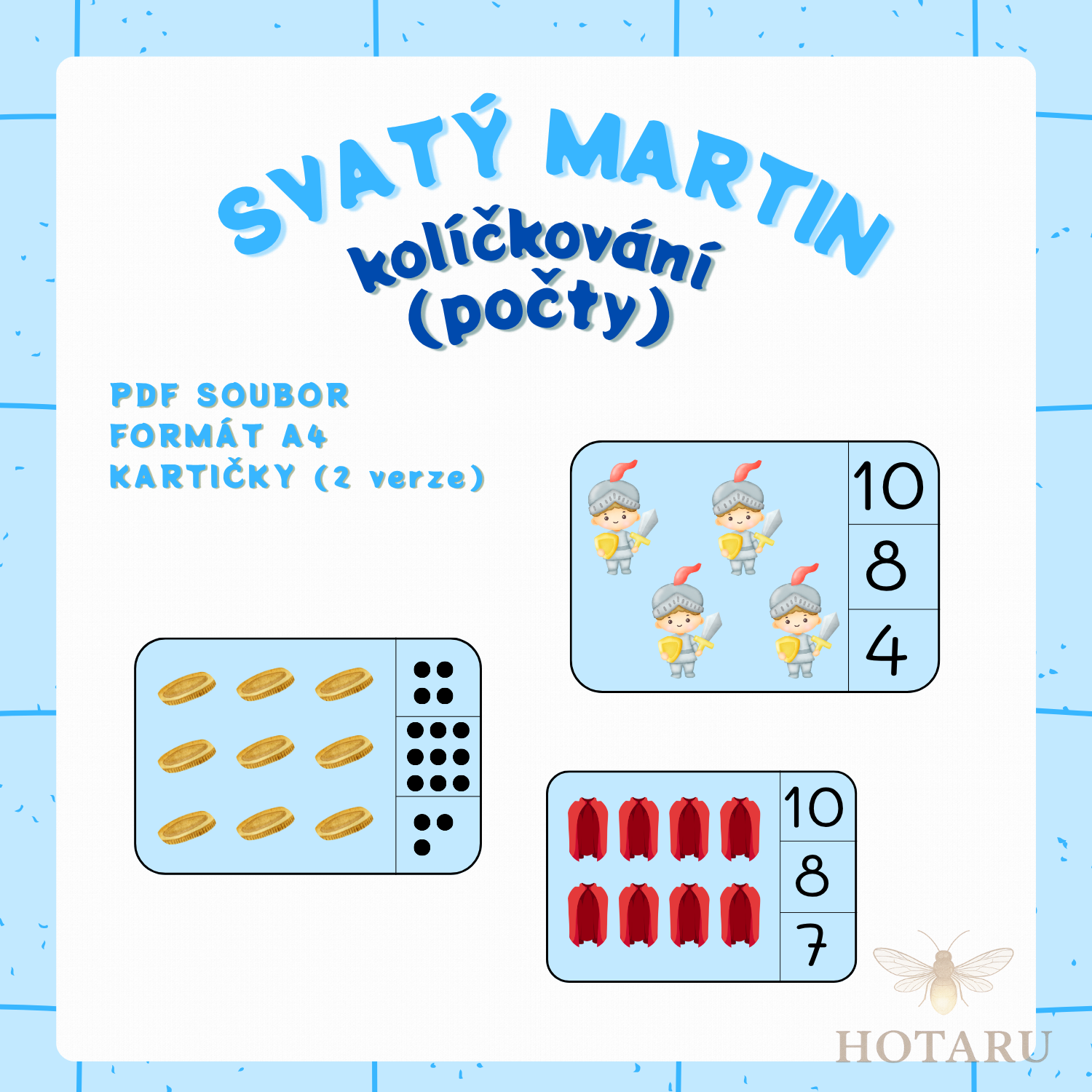 Tento soubor obsahuje sadu didaktických kartiček s tematikou svatého Martina, které rozvíjejí počítání, vizuální vnímání a logické myšlení dětí.