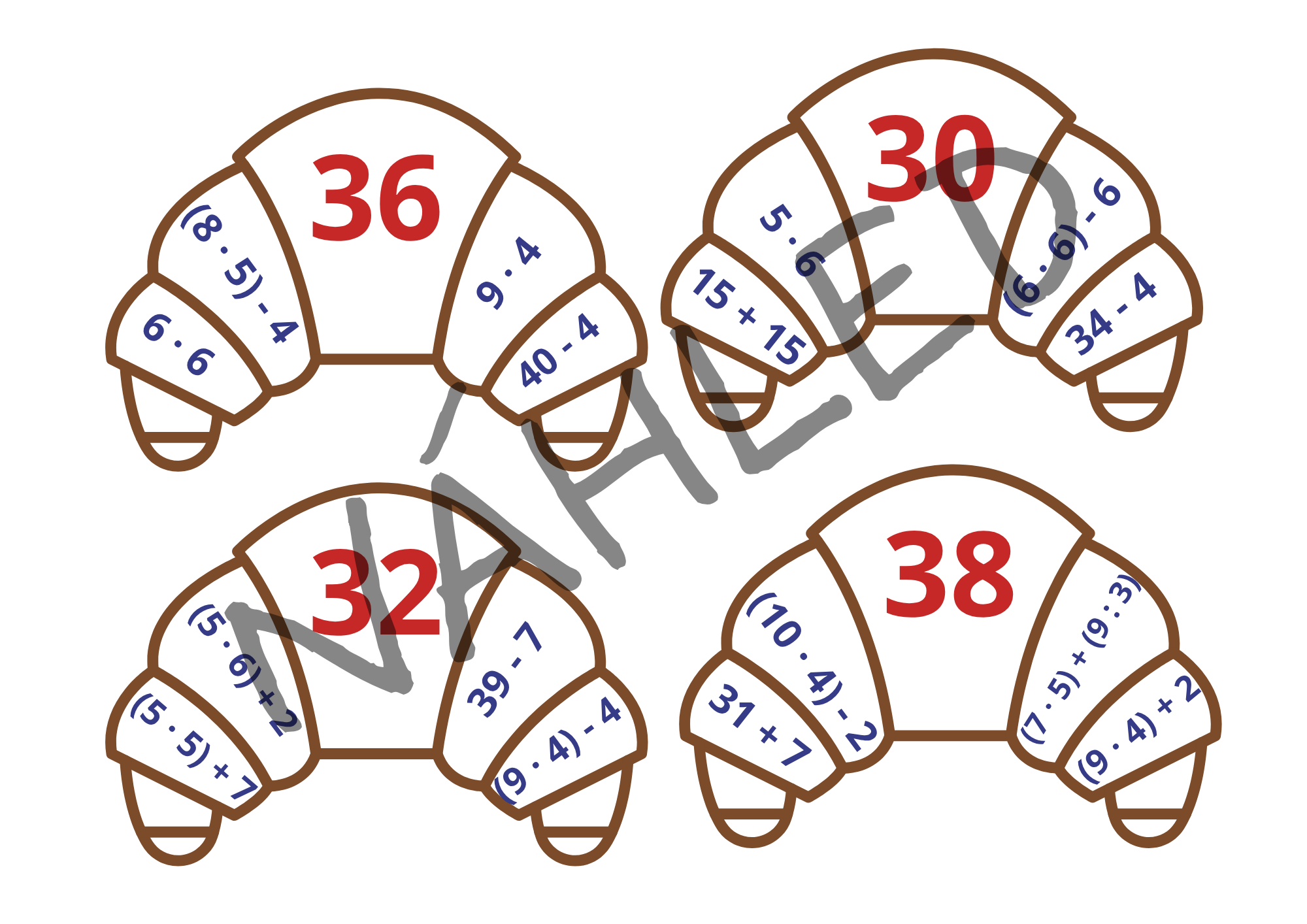 - rohlíčky rozstříhejte – děti mají za úkol přiřazovat části jednotlivých rohlíčků s příklady ke správnému výsledku,