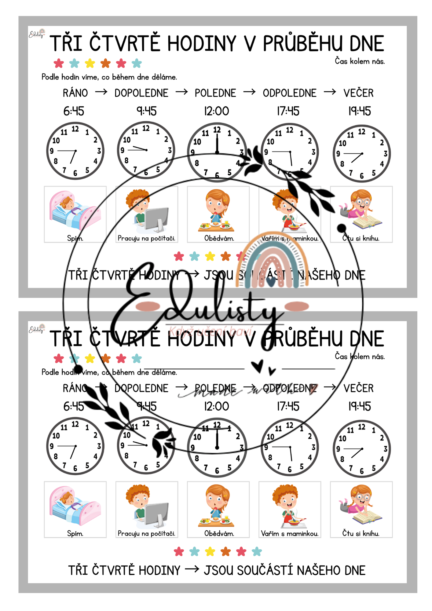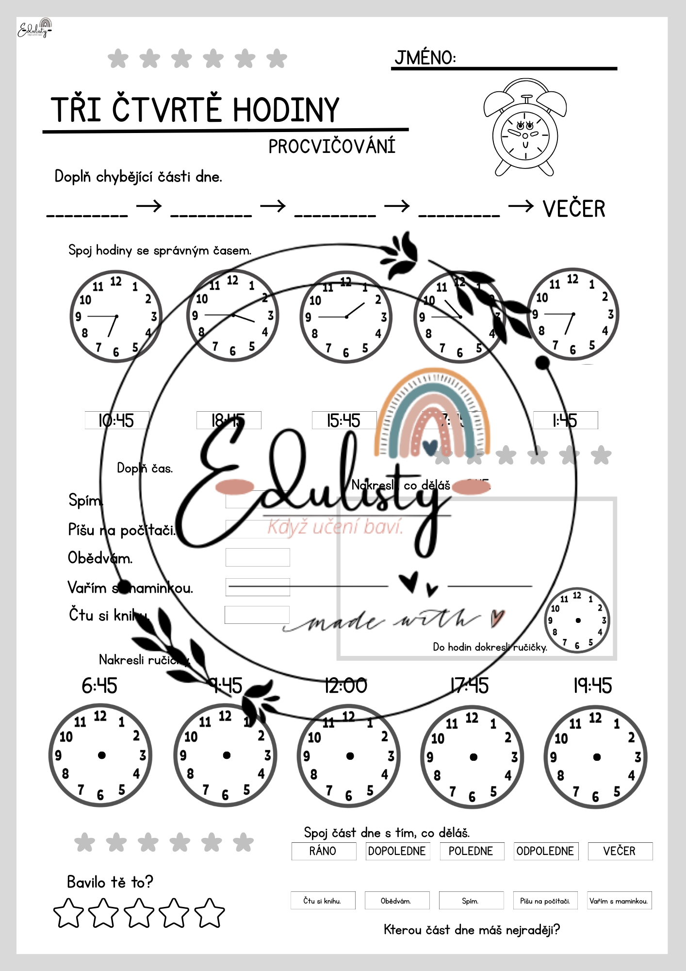 Součástí materiálu je také pracovní list, kde děti spojují hodiny se správným časem, doplňují části dne a kreslí ručičky do hodin podle zadání.