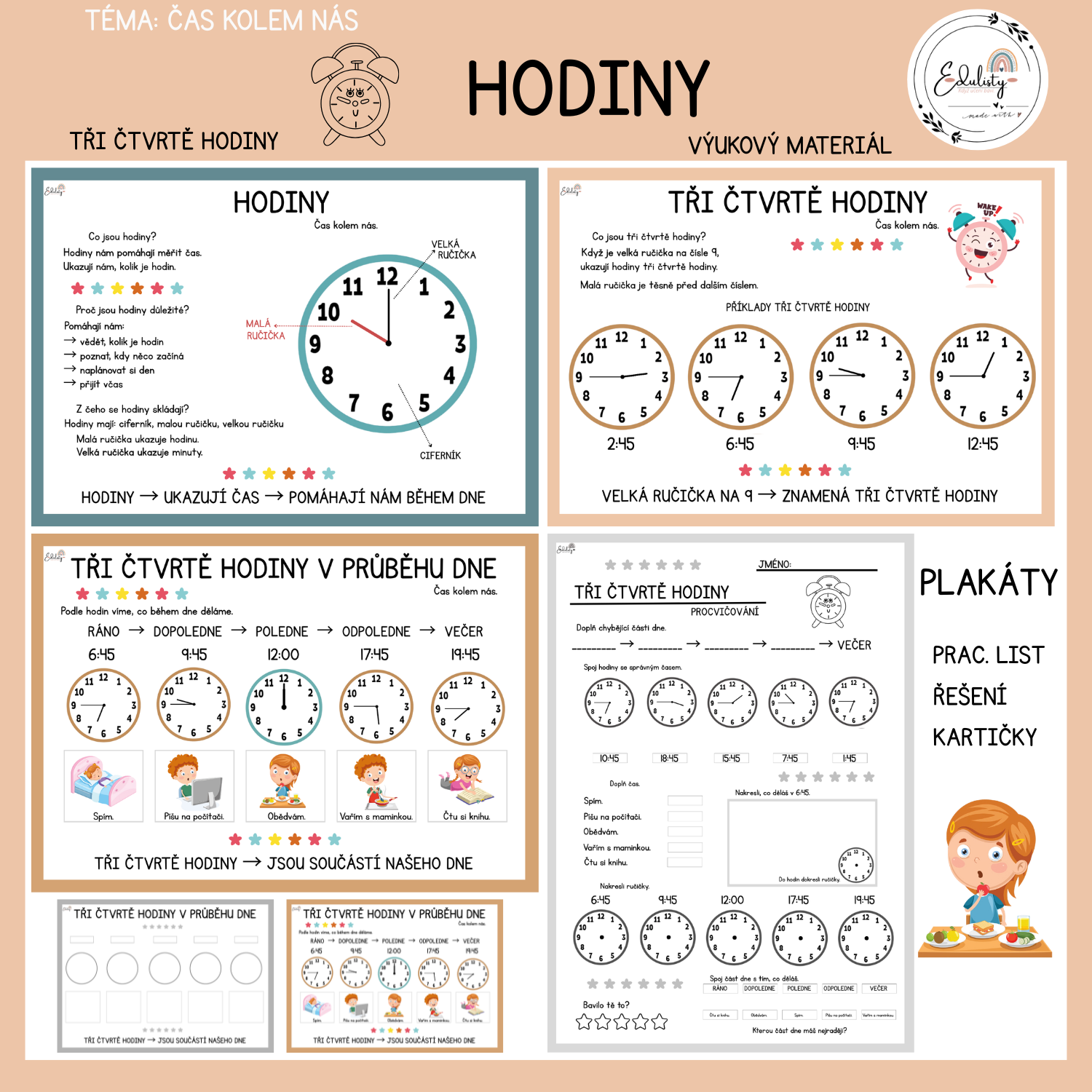 Součástí materiálu jsou názorné plakáty s vysvětlením principu tří čtvrtí hodiny a s ukázkami konkrétních časů (např. 2:45, 6:45, 9:45 nebo 12:00).