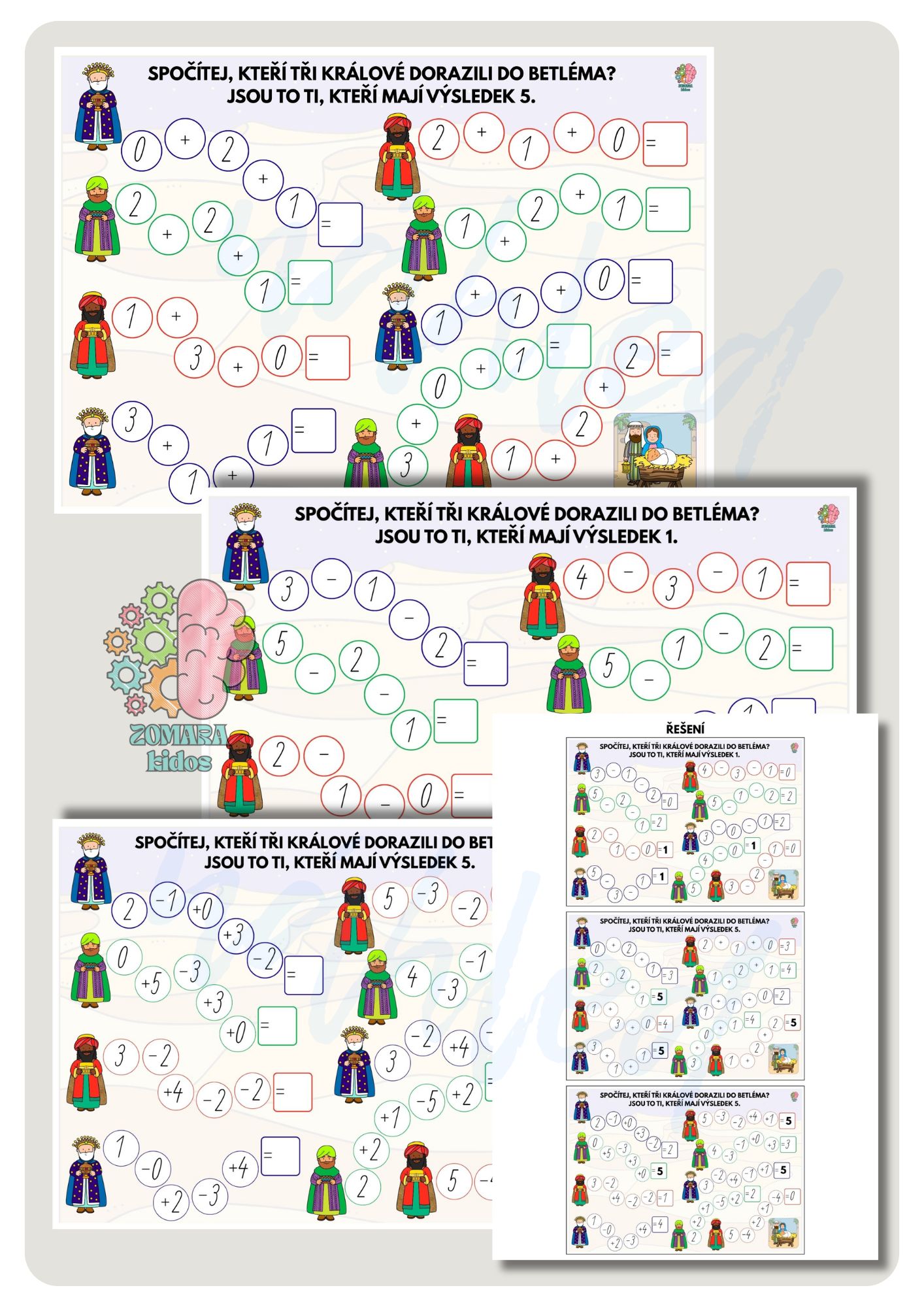 Králové se vydali do Betléma, ale ne všichni našli cestu. Děti počítají řetězové příklady do 5 a podle výsledků zjišťují, kteří tři králové nezabloudili a skutečně dorazili do cíle.