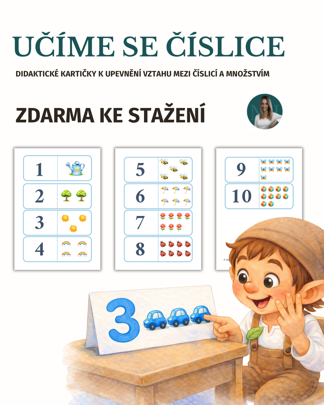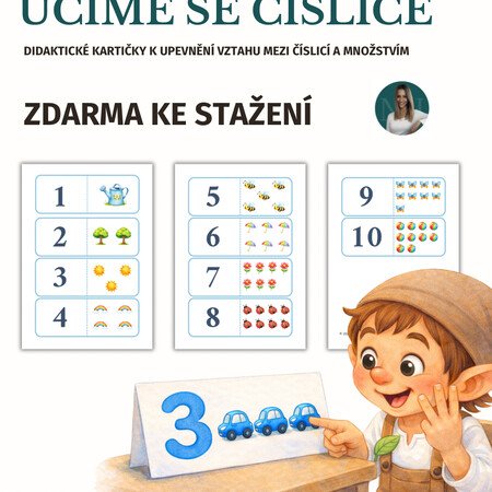 Jednoduché didaktické kartičky zaměřené na porozumění vztahu mezi číslicí a množstvím. Dítě nepracuje pouze se symbolem čísla, ale propojuje jej s konkrétním znázorněním – postupně si tak buduje skutečné porozumění tomu, co dané číslo vyjadřuje.