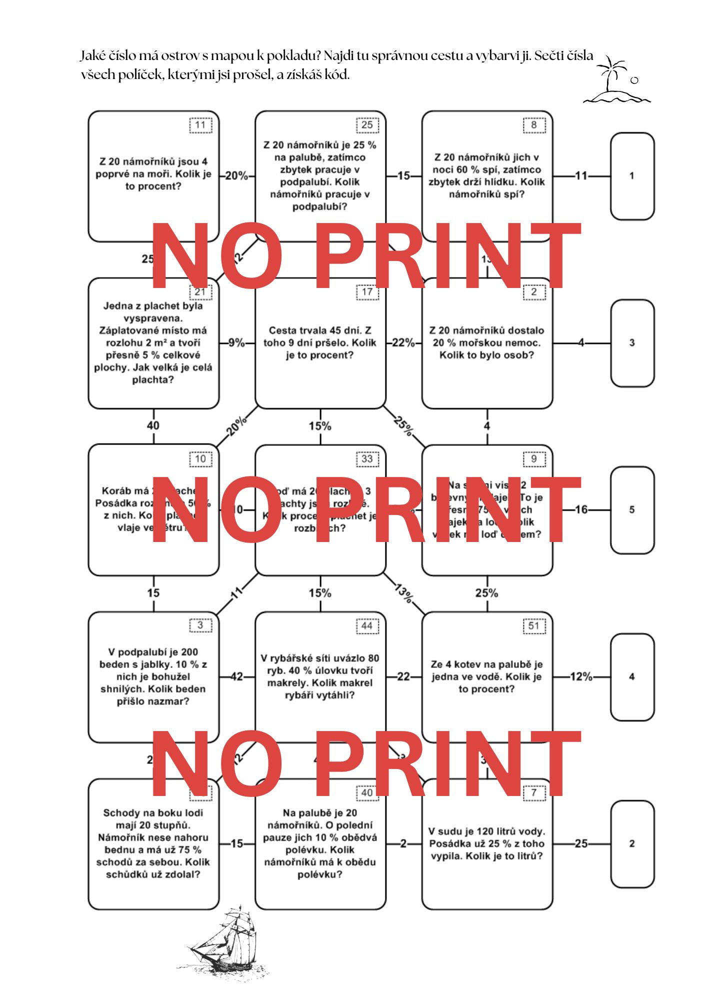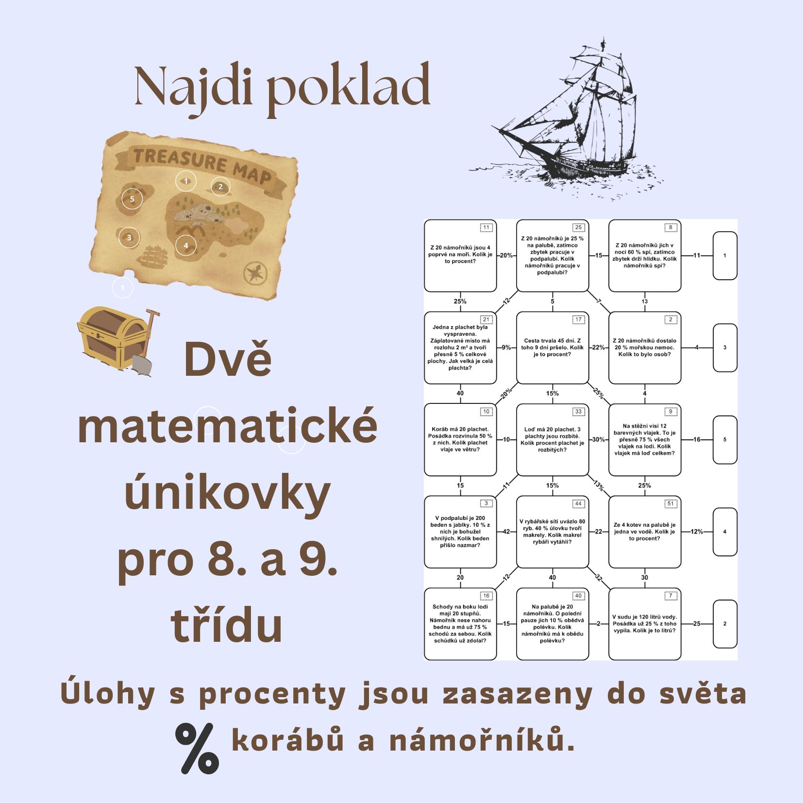 Tato matematická úniková hra s názvem „Plavba za pokladem“ slouží k procvičování procent. Hráči se vžívají do role mořeplavců, kteří musí správně navigovat svou loď skrze řadu matematických překážek, aby dosáhli cílového ostrova a získali kód k otevření truhly.