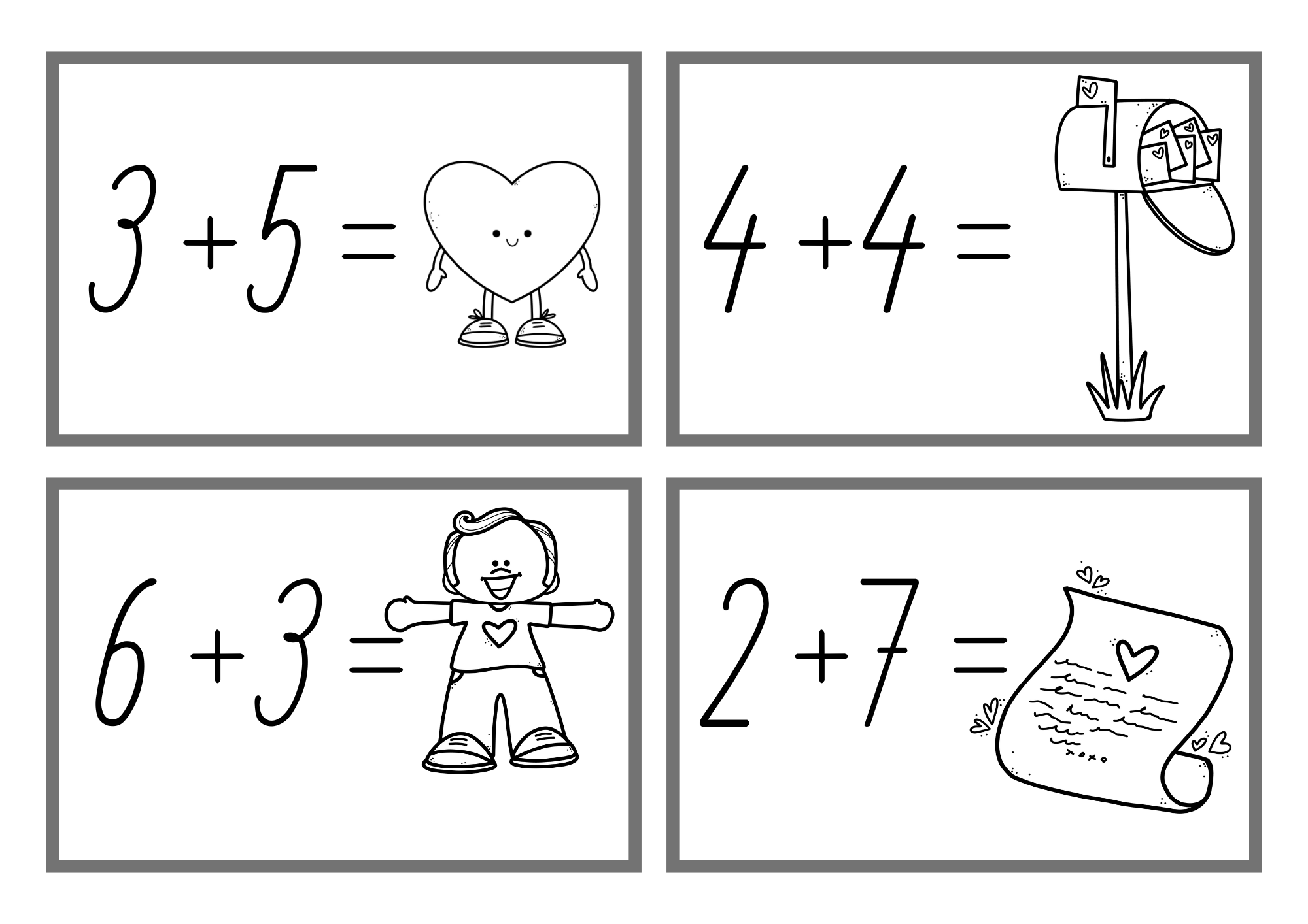 - 12 kartiček na sčítání a odčítání v oboru čísel do 8 (barevná i černobílá varianta),