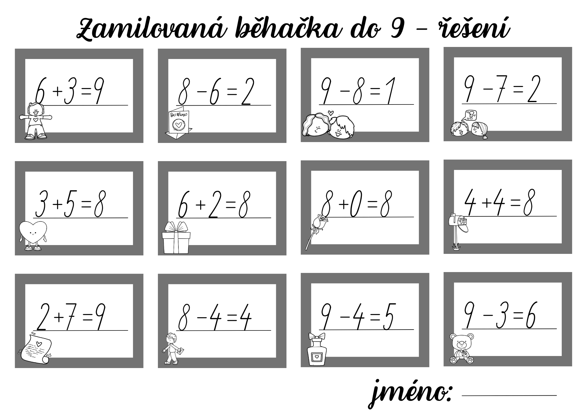 - 12 kartiček na sčítání a odčítání v oboru čísel do 9 (barevná i černobílá varianta),