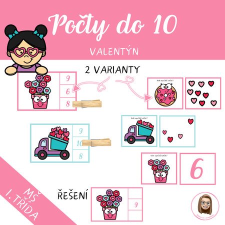 Soubor nabízí hravé valentýnské aktivity zaměřené na počítání do 10. Děti pracují s kartičkami, počítají obrázky, porovnávají množství a upevňují základní matematické dovednosti zábavnou formou.