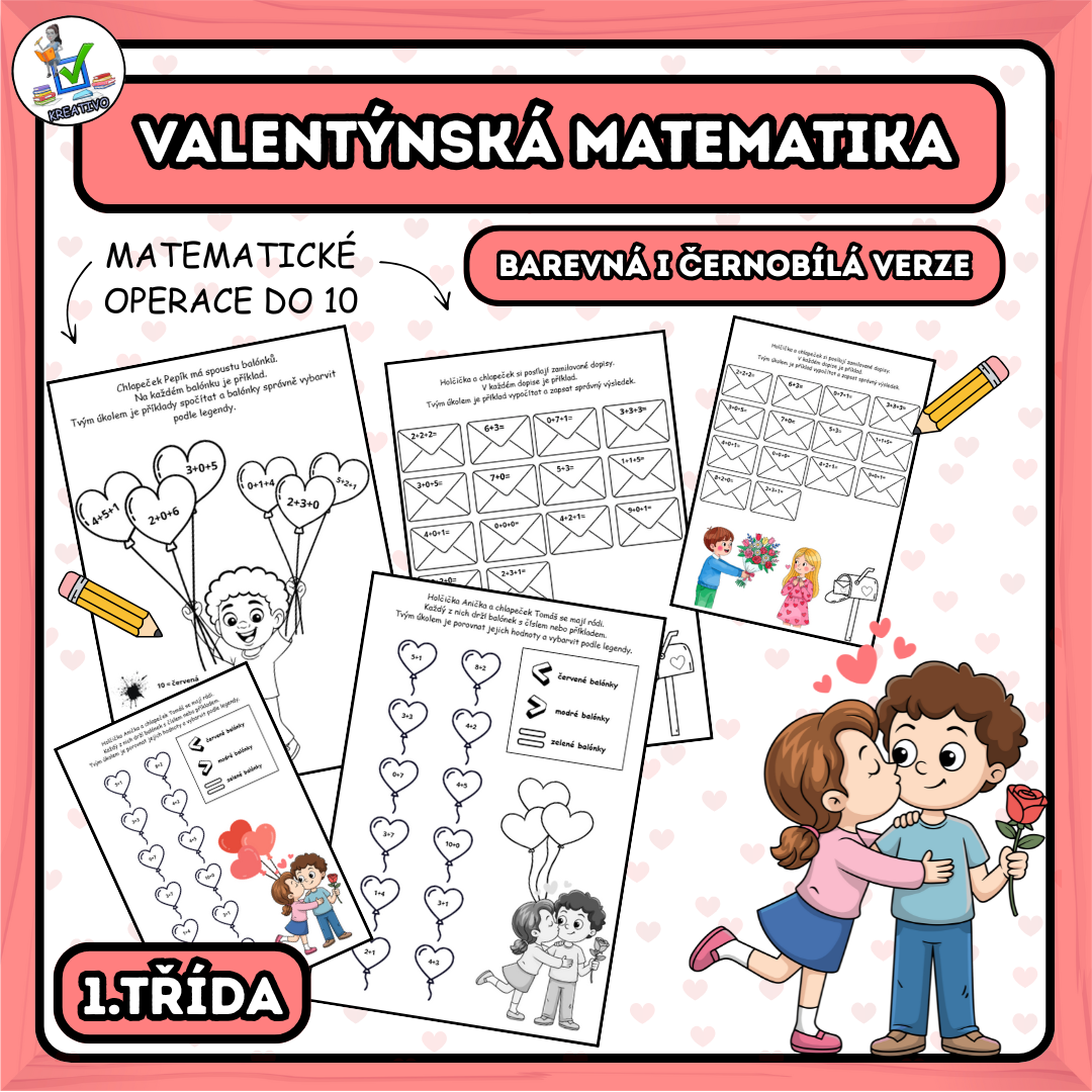 Soubor pracovních listů z matematiky na téma Valentýn pro žáky 1. třídy ZŠ, který slouží k procvičení základních početních dovedností v oboru do 10. Materiál je zpracován hravou a přehlednou formou, která děti baví a zároveň podporuje samostatnost.