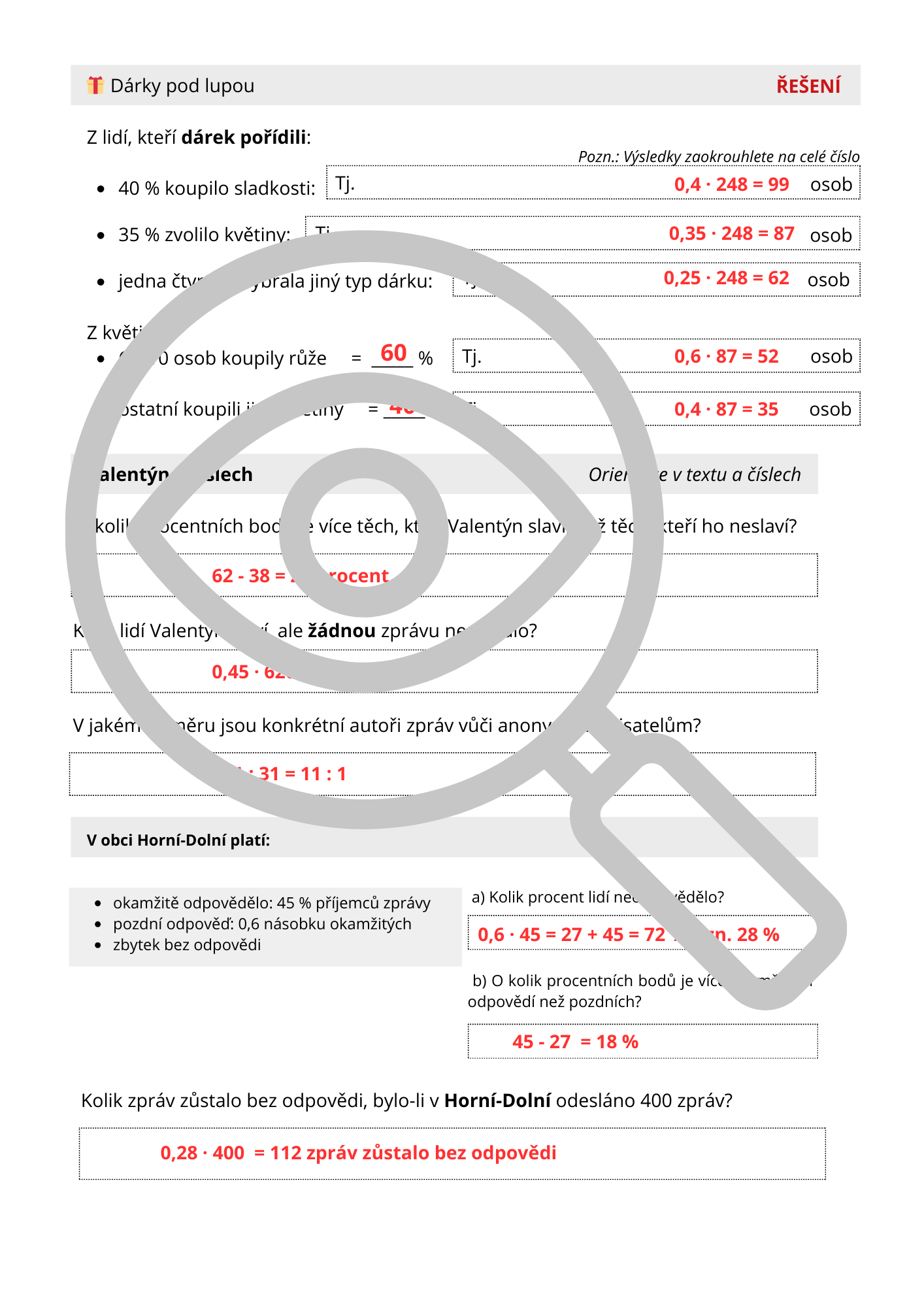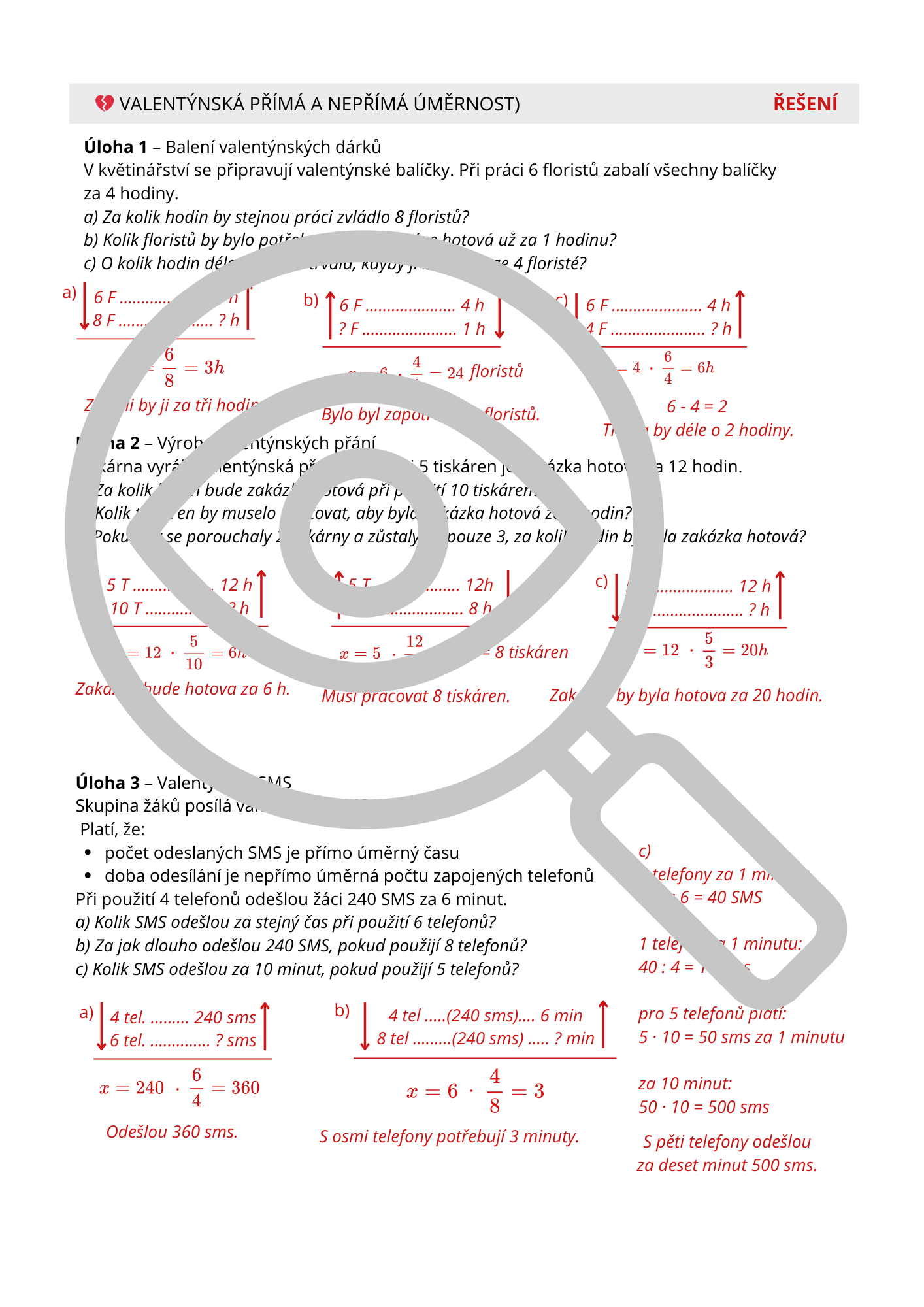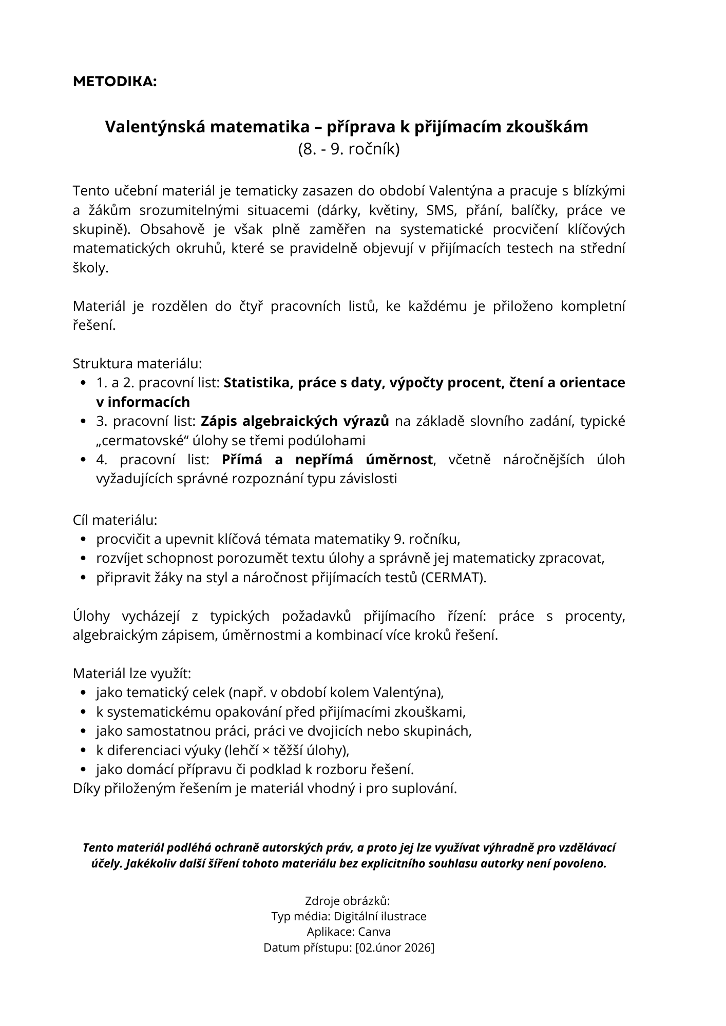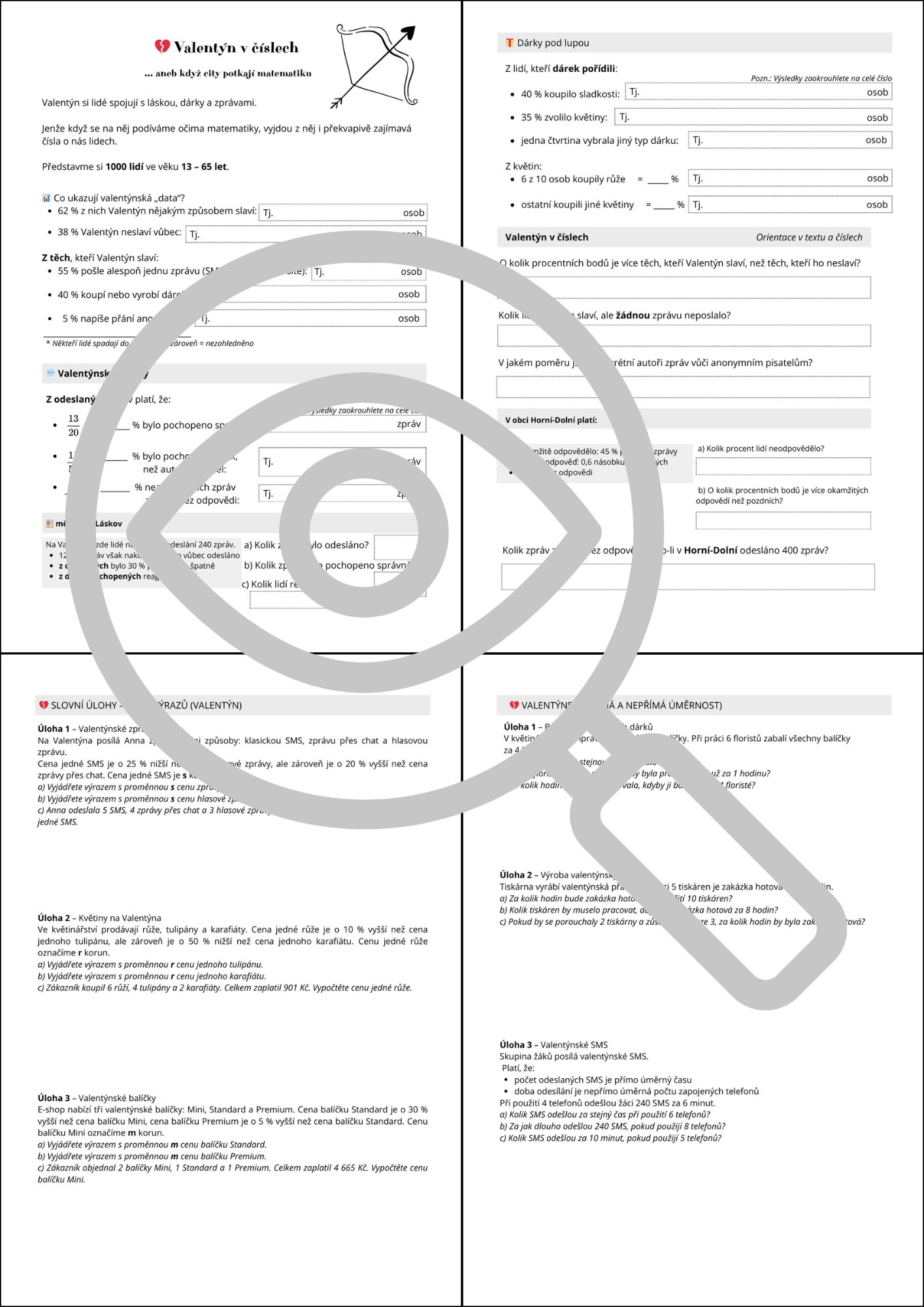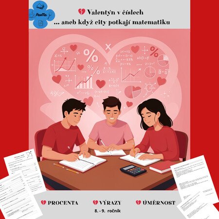 Tento učební materiál je tematicky zasazen do období Valentýna a pracuje s blízkými a žákům srozumitelnými situacemi (dárky, květiny, SMS, přání, balíčky, práce ve skupině). Obsahově je však plně zaměřen na systematické procvičení klíčových matematických okruhů, které se pravidelně objevují v přijímacích testech na střední školy.