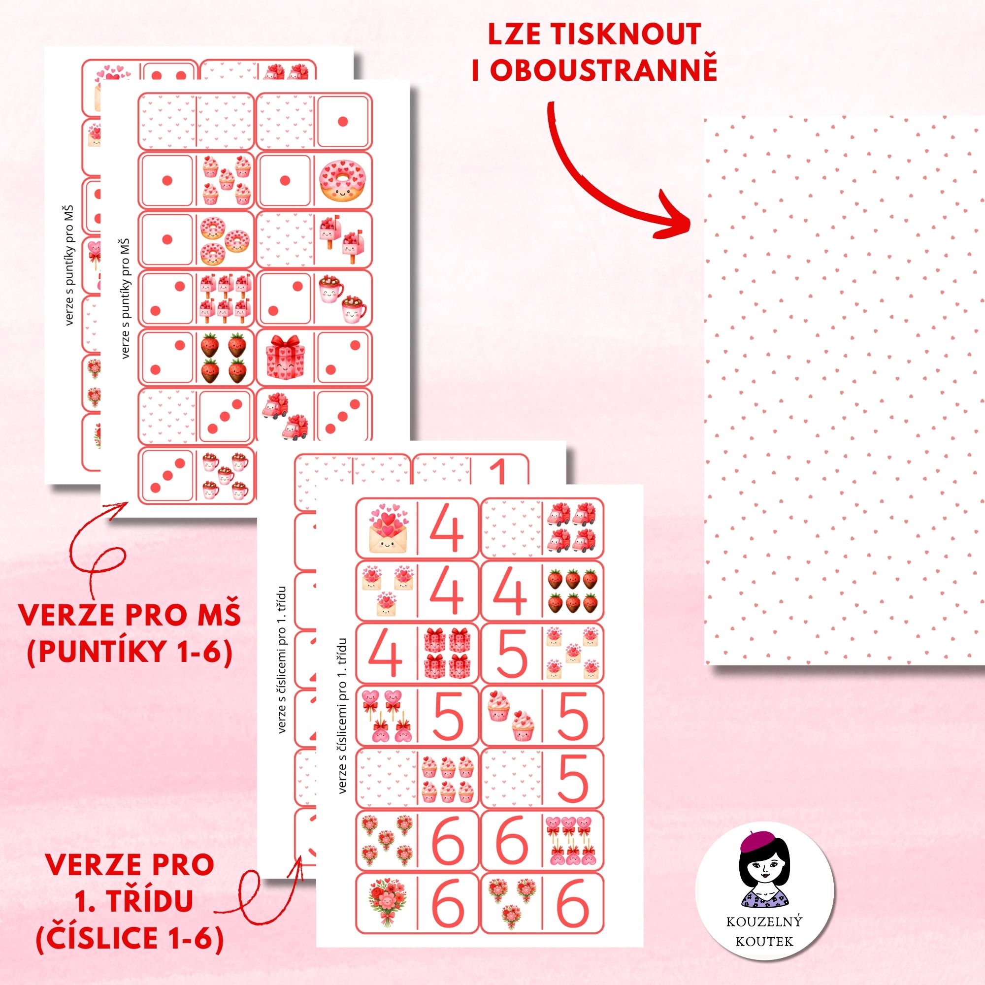 Jednoduchá a zábavná hra s valentýnskou tematikou pro děti v mateřské škole (verze s puntíky) a první třídě (verze s číslicemi). Děti při ní přiřazují kartičky s daným počtem symbolů k číslici/puntíkům.