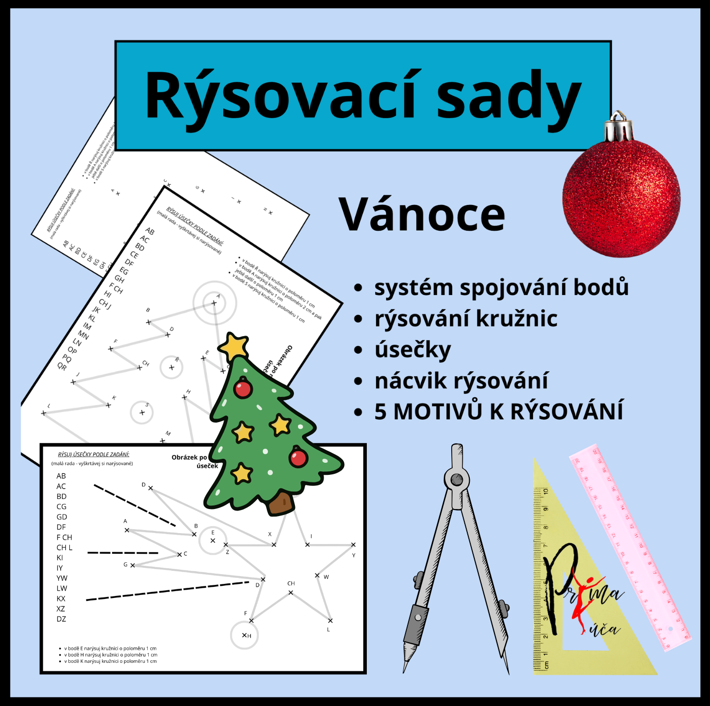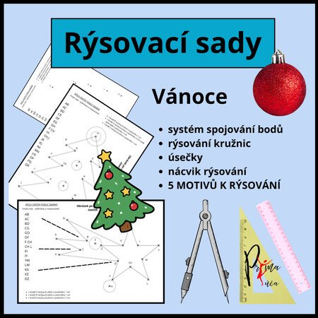 Tento pracovní list je určen pro žáky 2.–5. ročníku a slouží k procvičení geometrie, přesnosti práce s pravítkem a základů konstrukce. Žáci podle zadaných úseček rýsují obrysy vánočních motivů, které vznikají postupným spojováním bodů. V některých variantách je součástí i rýsování kružnic pomocí kružítka.