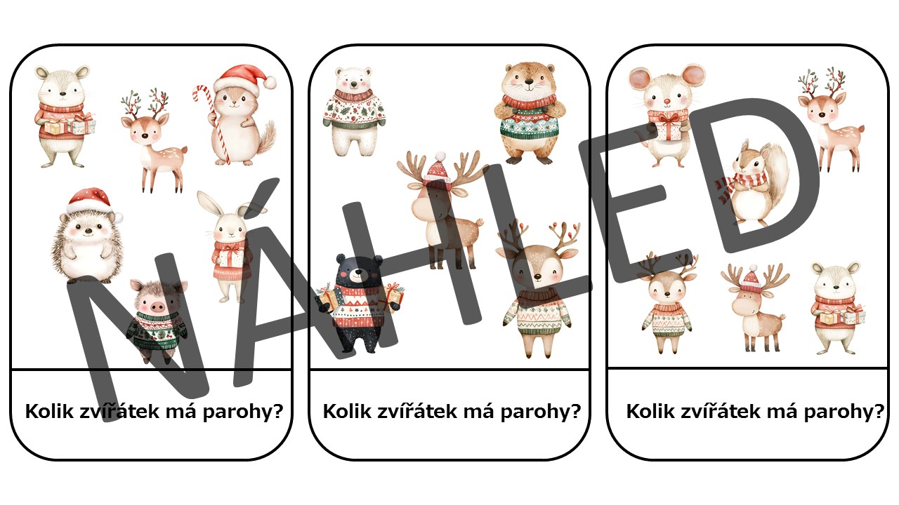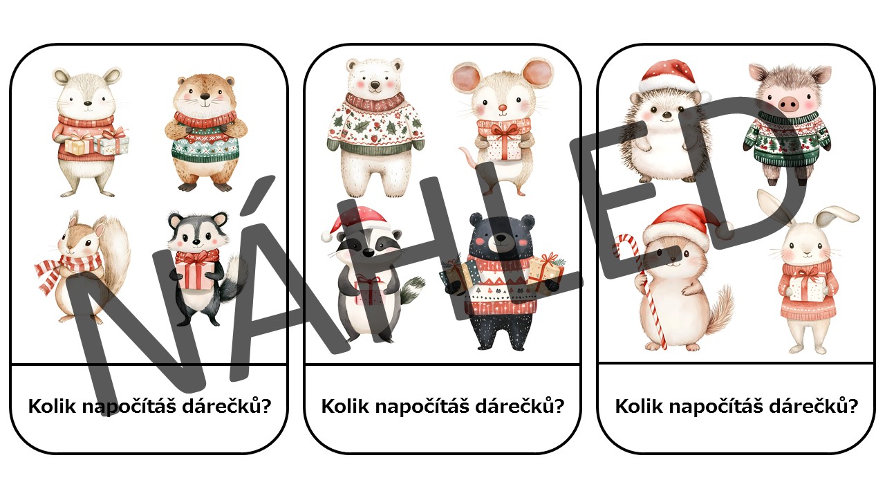 - 15 úkolových kartiček (dárky, svetry, parohy, šály…)