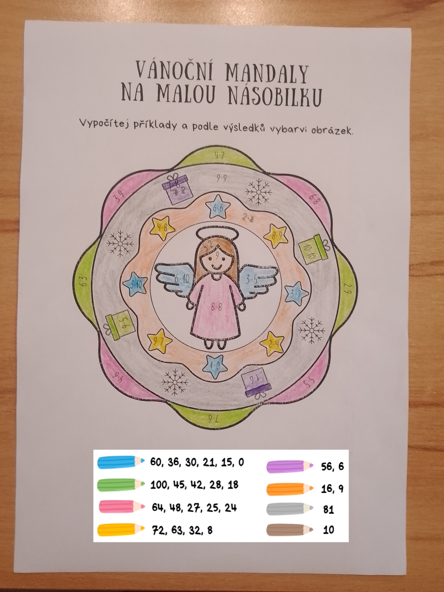Úkolem žáků je příklady vypočítat a podle výsledků mandalu vybarvit.