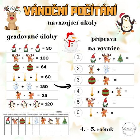 Žáci řeší 9 algebrogramů – v každém je několik vánočních obrázků (např. ozdoba, perníček...), které představují neznámá čísla.
