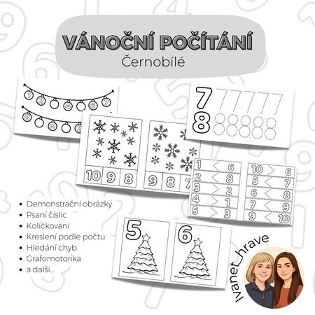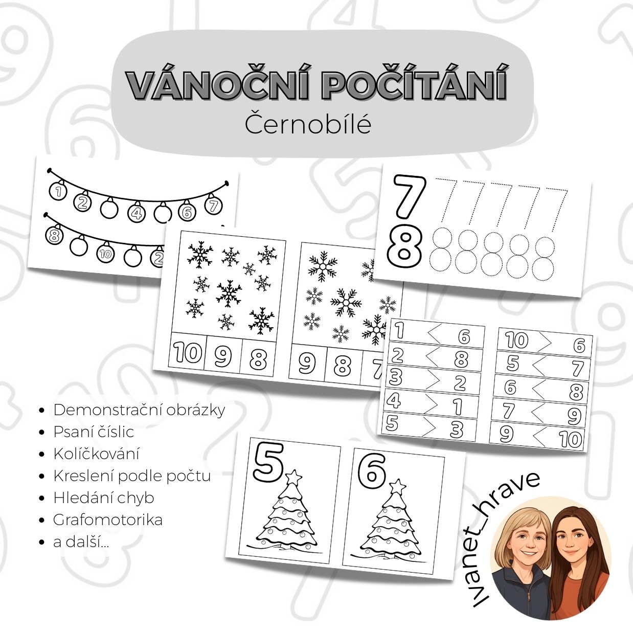 Objevte jedinečný pracovní sešit Vánoční počítání, který rozzáří učení matematiky u dětí předškolního věku i prvňáčků! Tento tematický výukový materiál spojuje vánoční atmosféru a zábavné úkoly – děti se učí čísla a počítání přirozeně, hrou a tvořením.