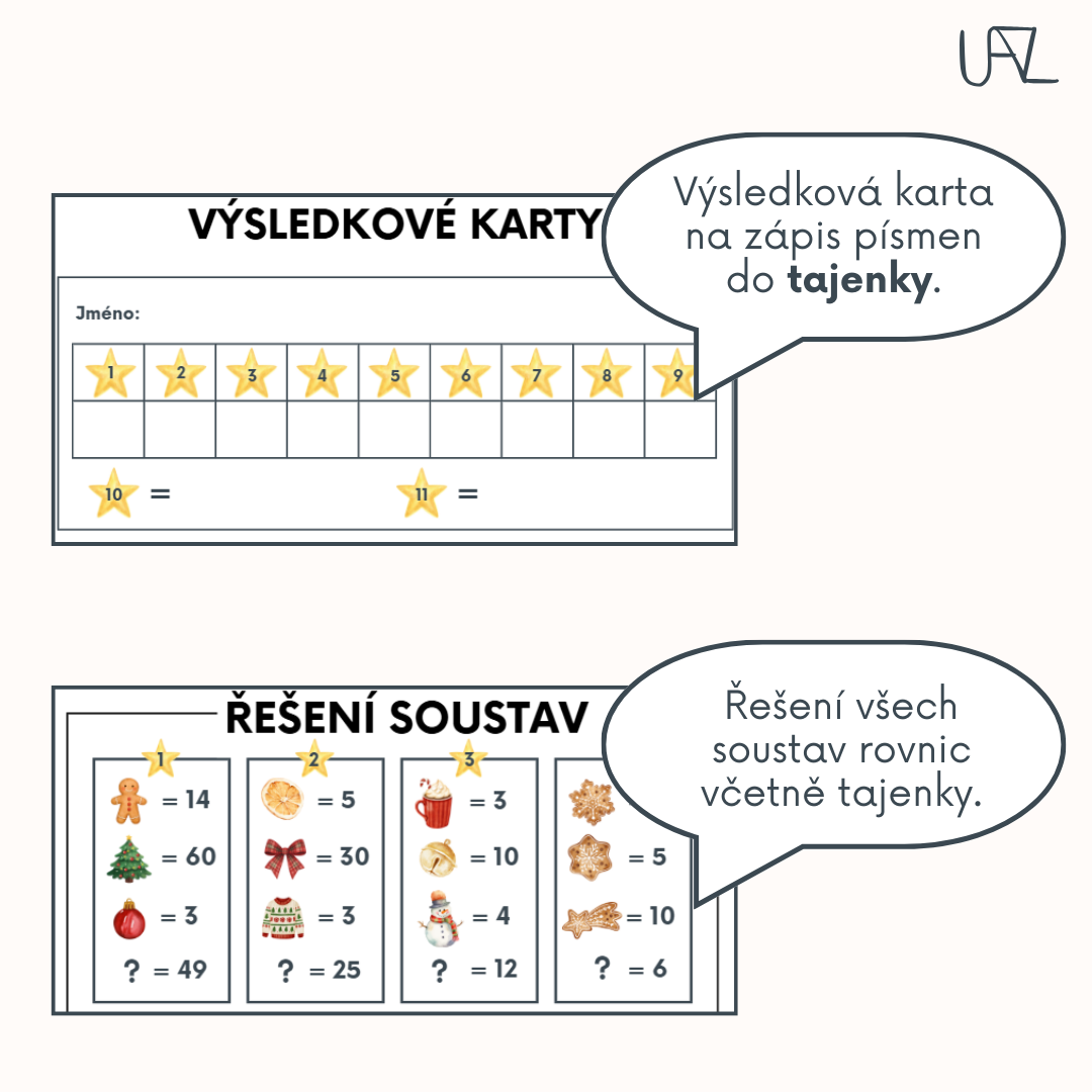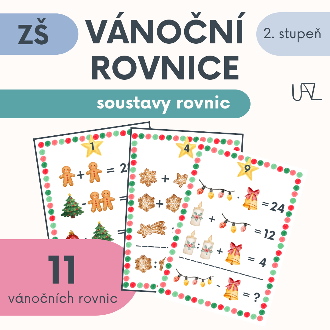 Cíl: týmová nebo i samostatná aktivita, při které žáci logickými úvahami řeší obrázkové soustavy rovnic. Není podmínkou znalost sčítací či dosazovací metody. Úlohy se dají řešit jednoduchými matematickým úvahami, které rozvíjí abstraktní matematické myšlení žáků.