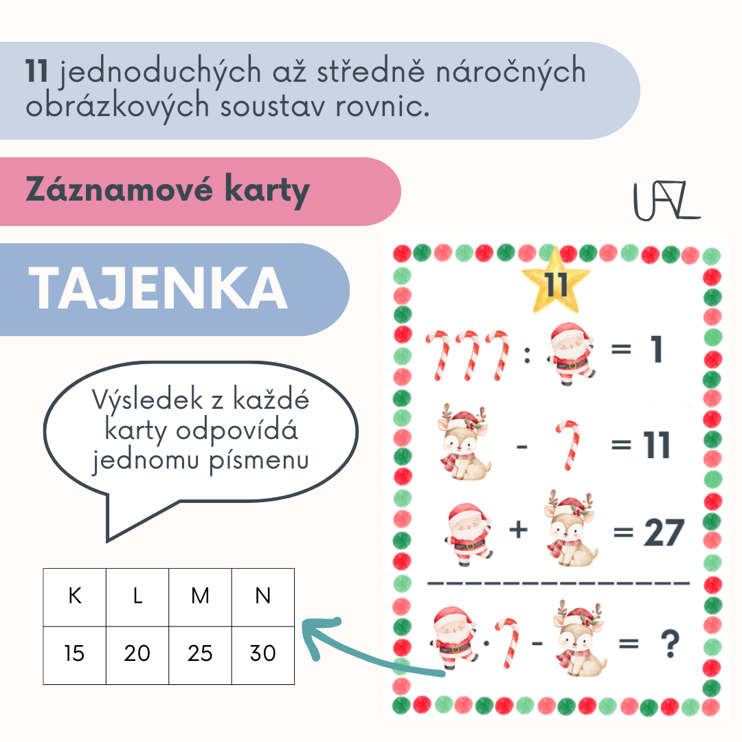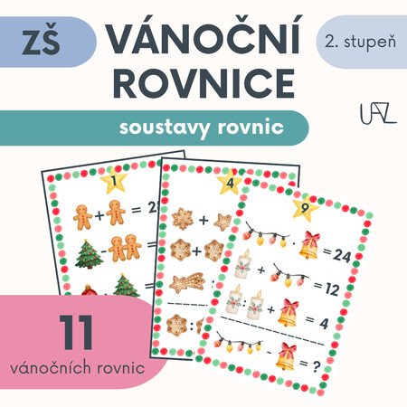 Obsah: 11 jednoduchých až středně náročných obrázkových rovnic s tajenkou, řešením, záznamové karty pro žáky, tipy na využití ve výuce, krátké vánoční povídání