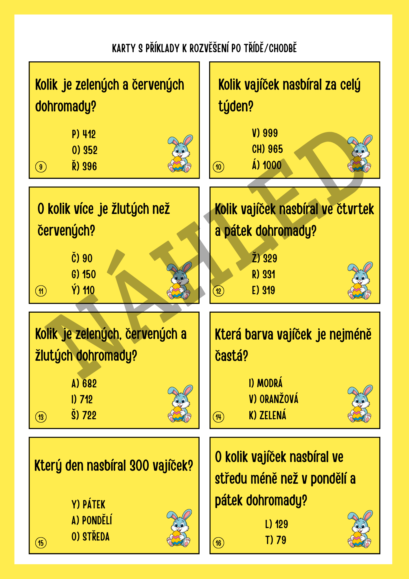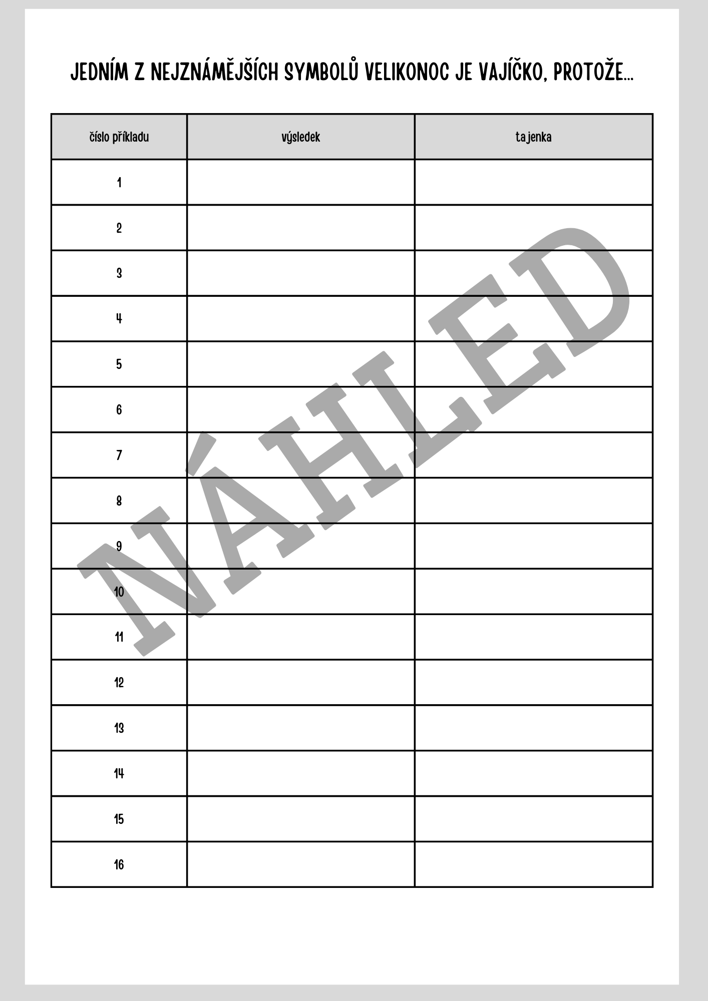 Tato aktivita kombinuje matematické počítání s pohybem a zábavným luštěním tajenky. Děti obíhají stanoviště, na kterých jsou umístěny příklady (při hezkém počasí možnost také venku). Odpovědi zapisují do tabulky. Každá správná odpověď zároveň odhaluje písmeno tajenky.