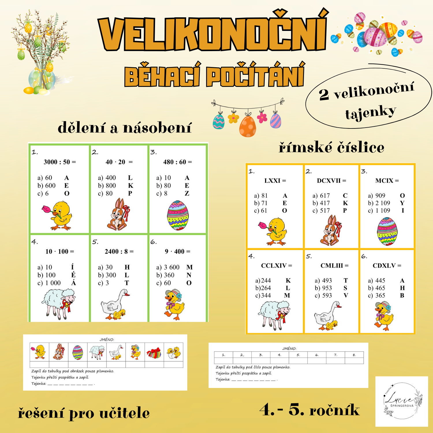 - Po třídě rozmístěte kartičky. Děti mají na lavici záznamový papír, kam zapisují písmenka. Žáci vypočítají příklad zpaměti a zapamatují si číslo nebo obrázek a písmenko.