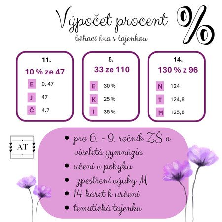 Běhací hra pro celou třídu nebo i pro jednotlivce, rychlejší žáky k procvičení výpočtu procent. Soubor obsahuje 14 karet s příklady a vždy tři možnosti odpovědi. Jen jedna je však správná. Po určení správné možnosti u všech karet vyjde žákům tematicky zaměřená tajenka, kterou si zapisují do svého pracovního listu. Nakonec si práci kontrolují podle kontrolky. Ideální k rychlému procvičení probíraného učiva. Vhodné pro 6. - 9. ročník ZŠ.