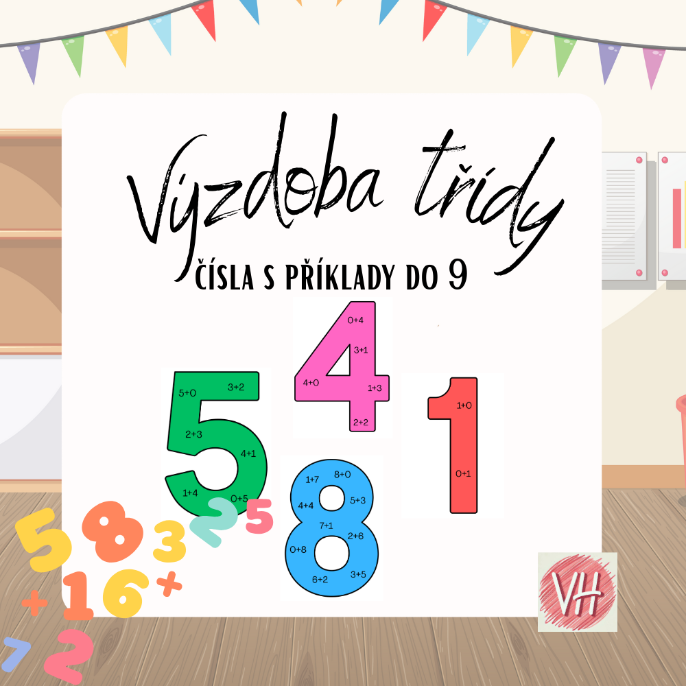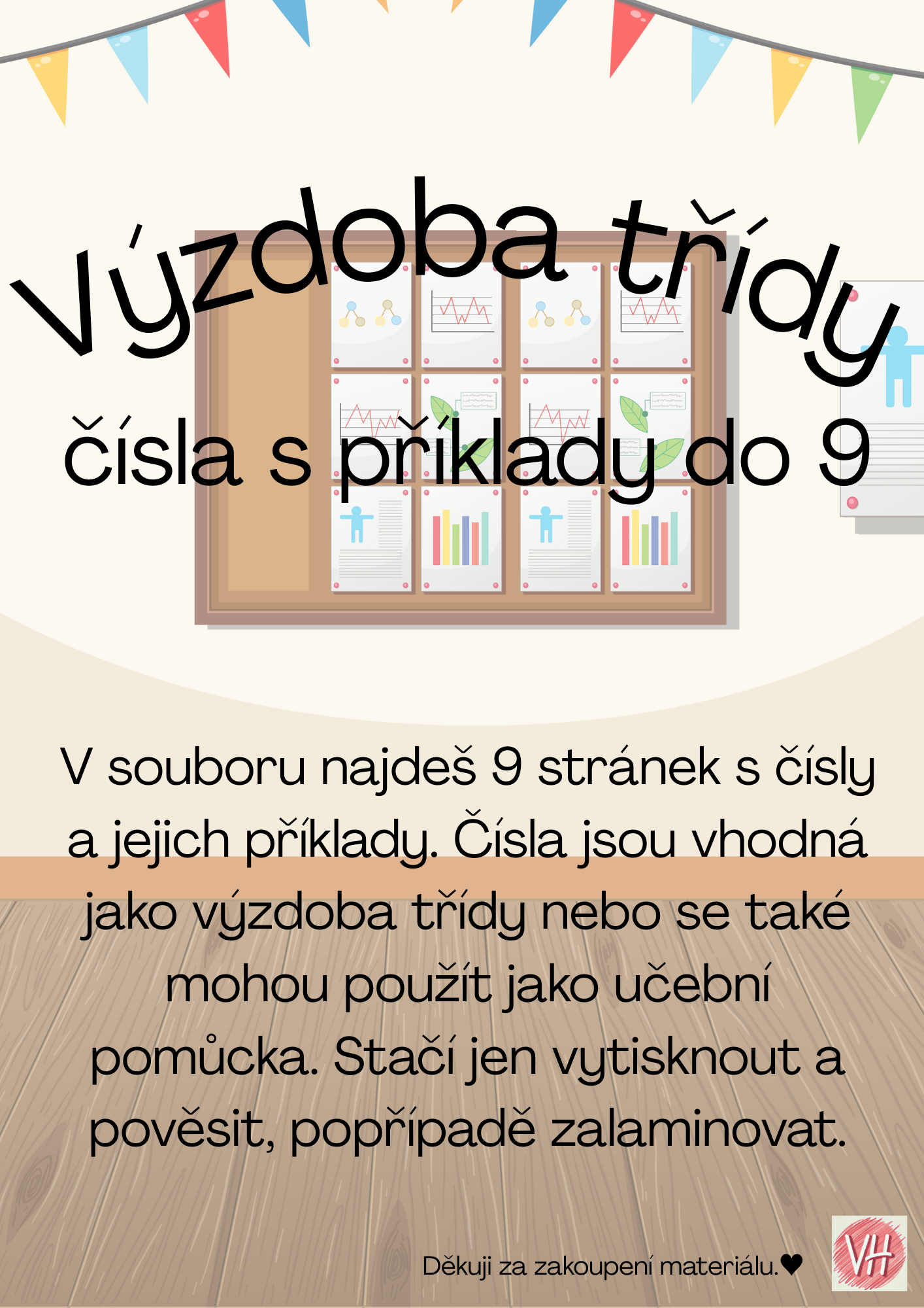 V souboru najdeš 9 stránek s čísly a jejich příklady. Čísla jsou vhodná jako výzdoba třídy nebo se také mohou použít jako učební pomůcka. Stačí jen vytisknout a pověsit, popřípadě zalaminovat.