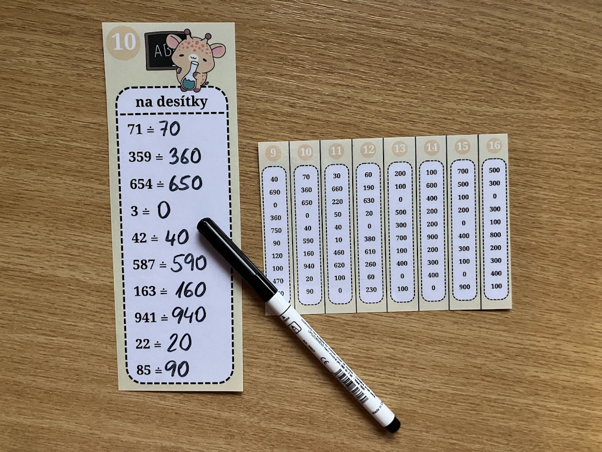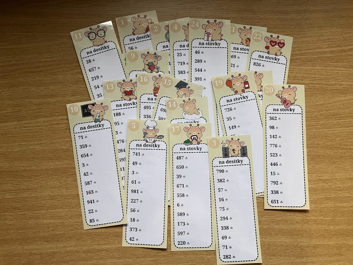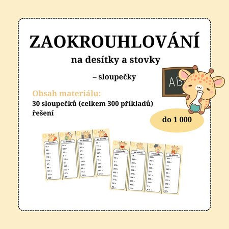 Sloupečky na procvičování zaokrouhlování čísel do 1 000 na desítky a stovky v motivu žiraf.