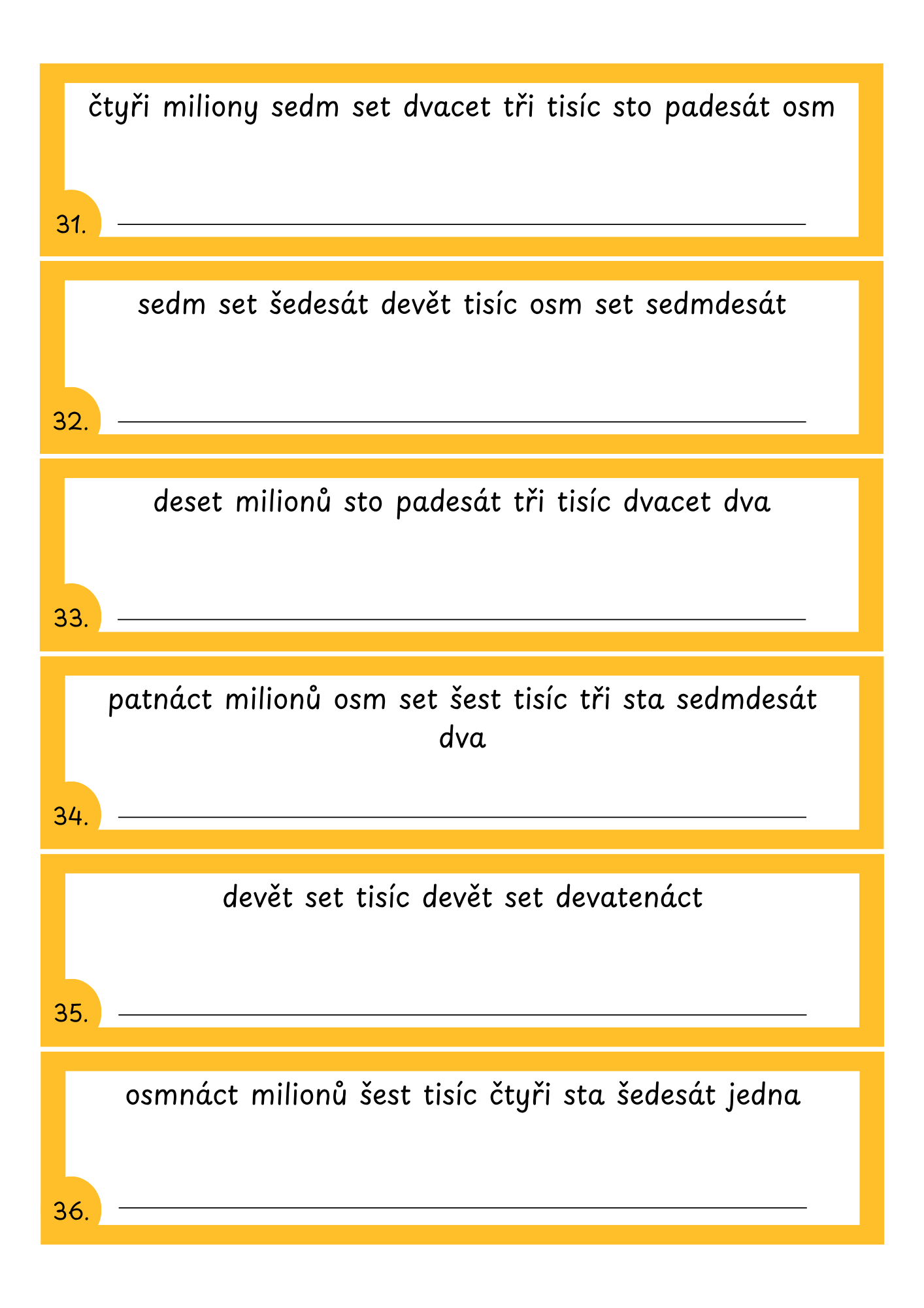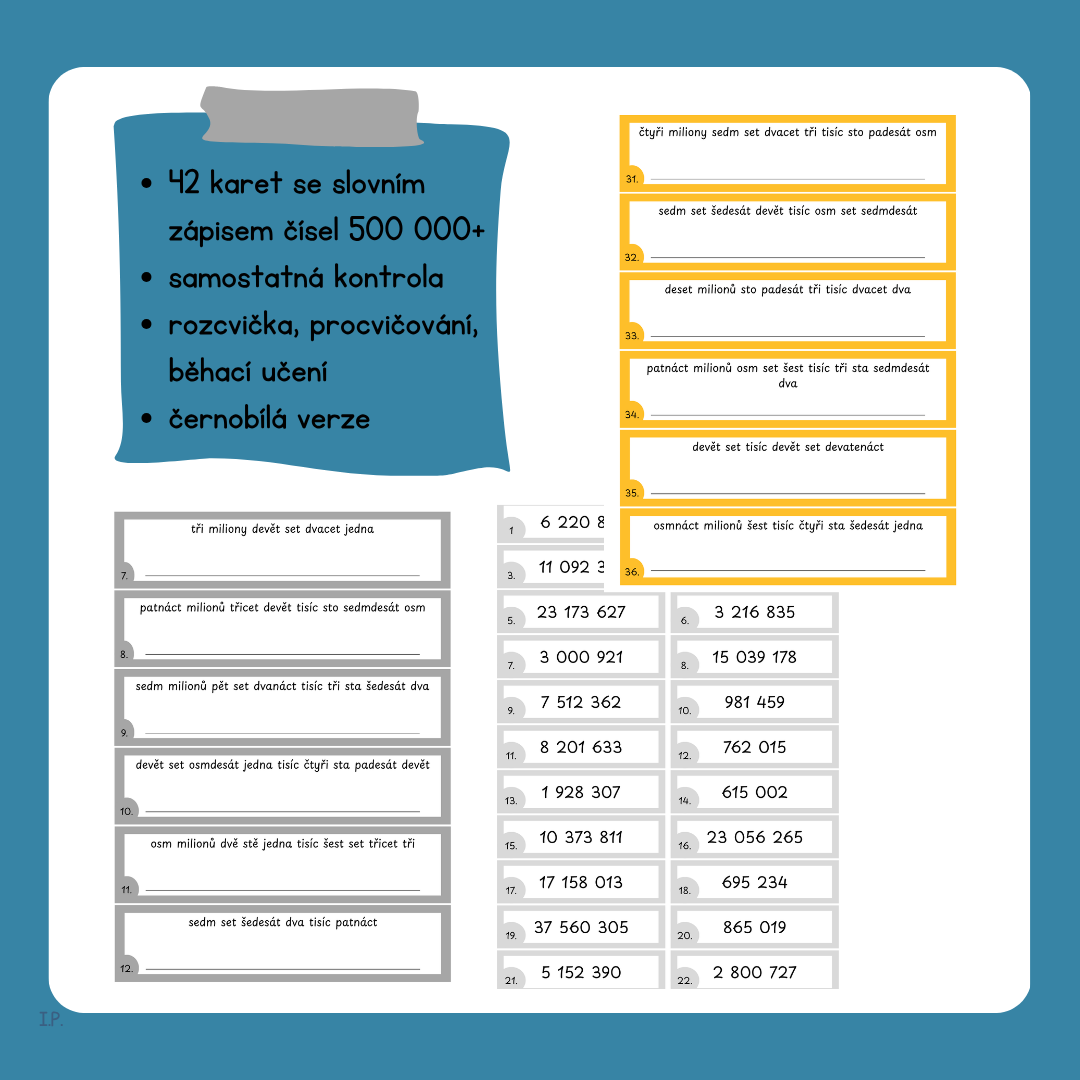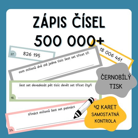 Následující materiál obsahuje 42 karet se slovním zápisem čísel v oboru 500 000+. Úkolem žáků je čísla přepsat pomocí číslic podle zadaného slovního zápisu. Součástí materiálu je samostatná kontrola i černobílá varianta pro úsporný tisk. Aktivita je vhodná jako rozcvička, procvičování i samostatná práce v centrech aktivit. Pomůcka pomáhá žákům upevnit čtení a zápis velkých čísel.