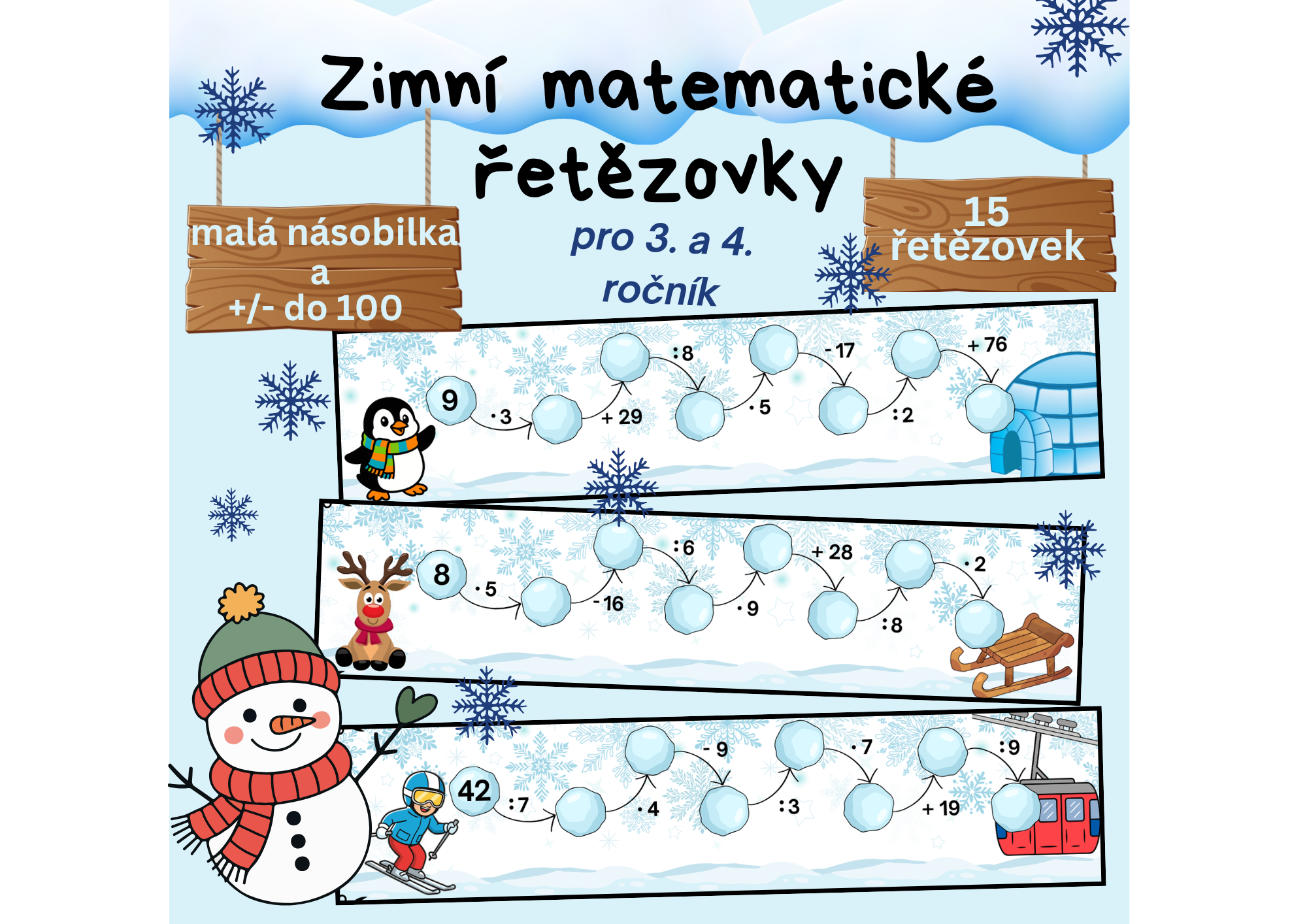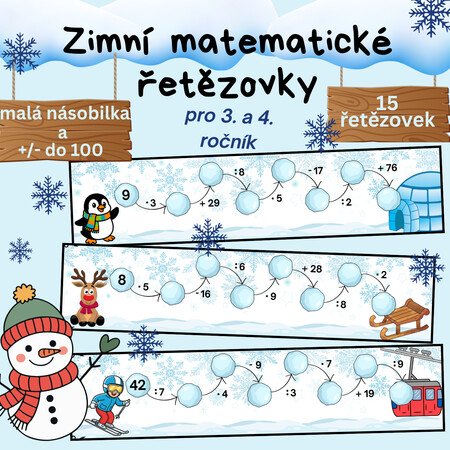 Zimní matematické řetězovky jsou ideální pro ranní rozcvičky, opakování, práci ve skupinách i pro samostatnou práci žáků.