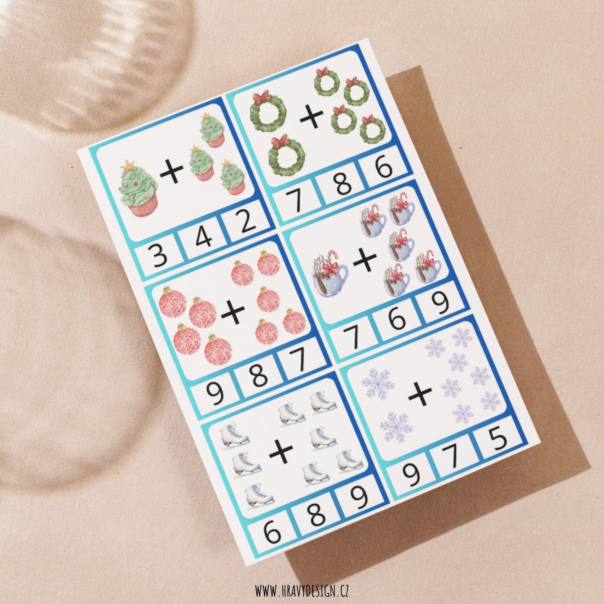 Každá kartička obsahuje zimní obrázky, které dítě spočítá, sečte a označí správnou odpověď kolíčkem.