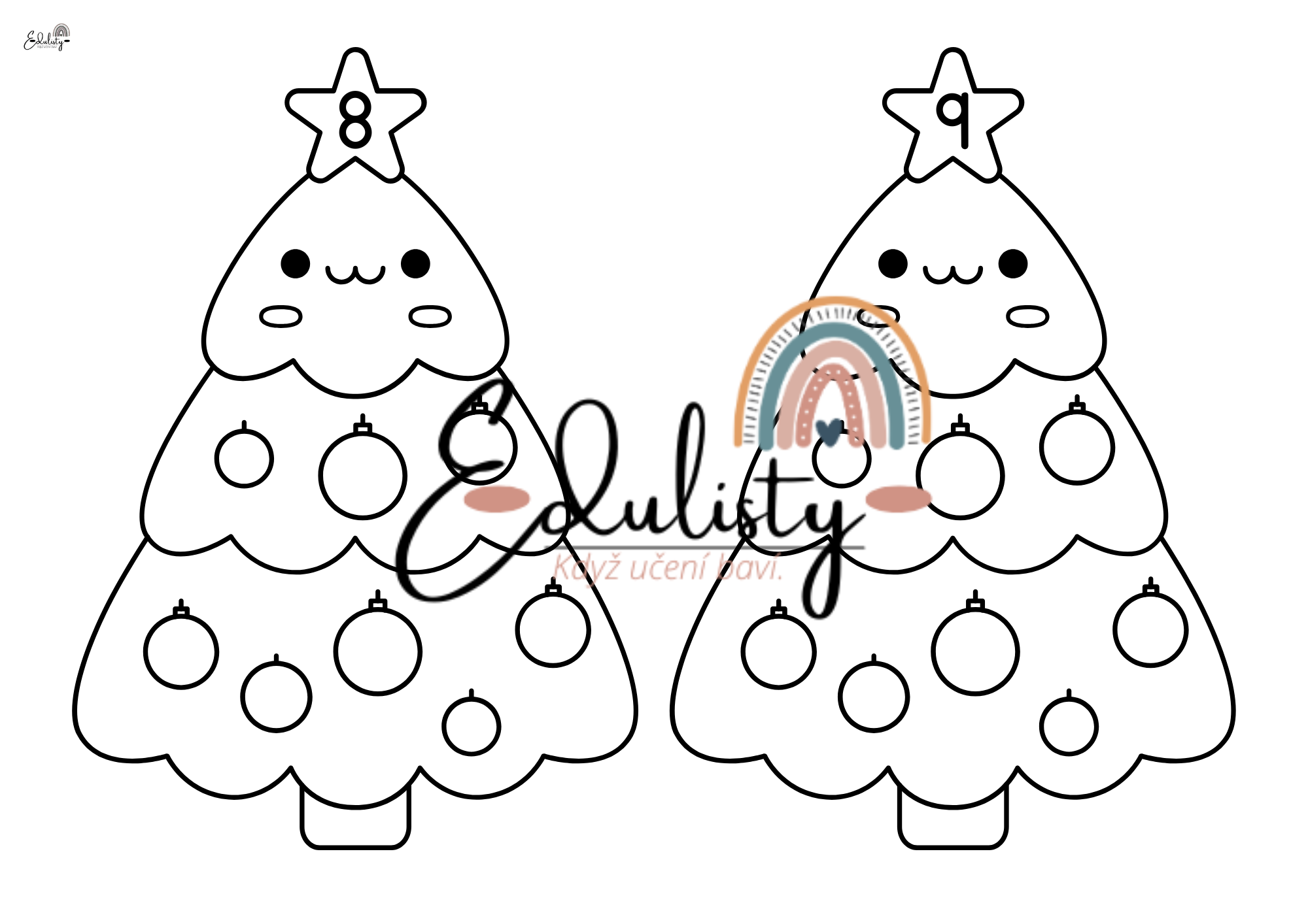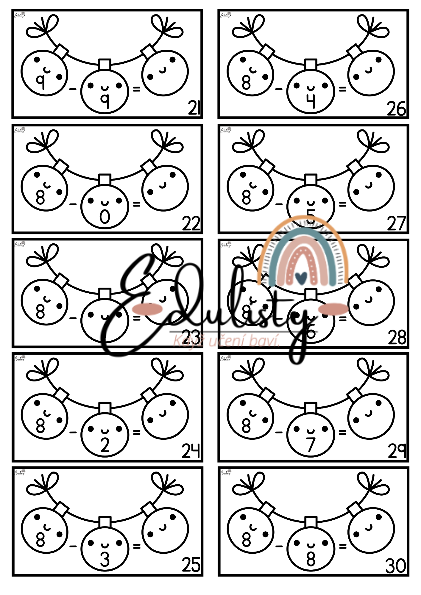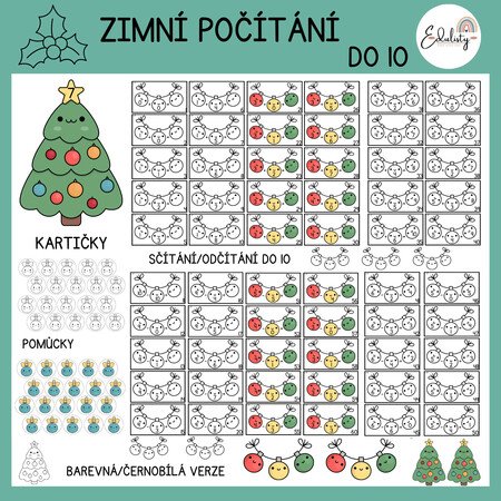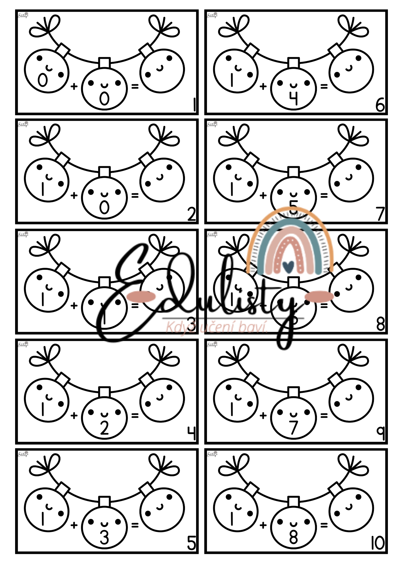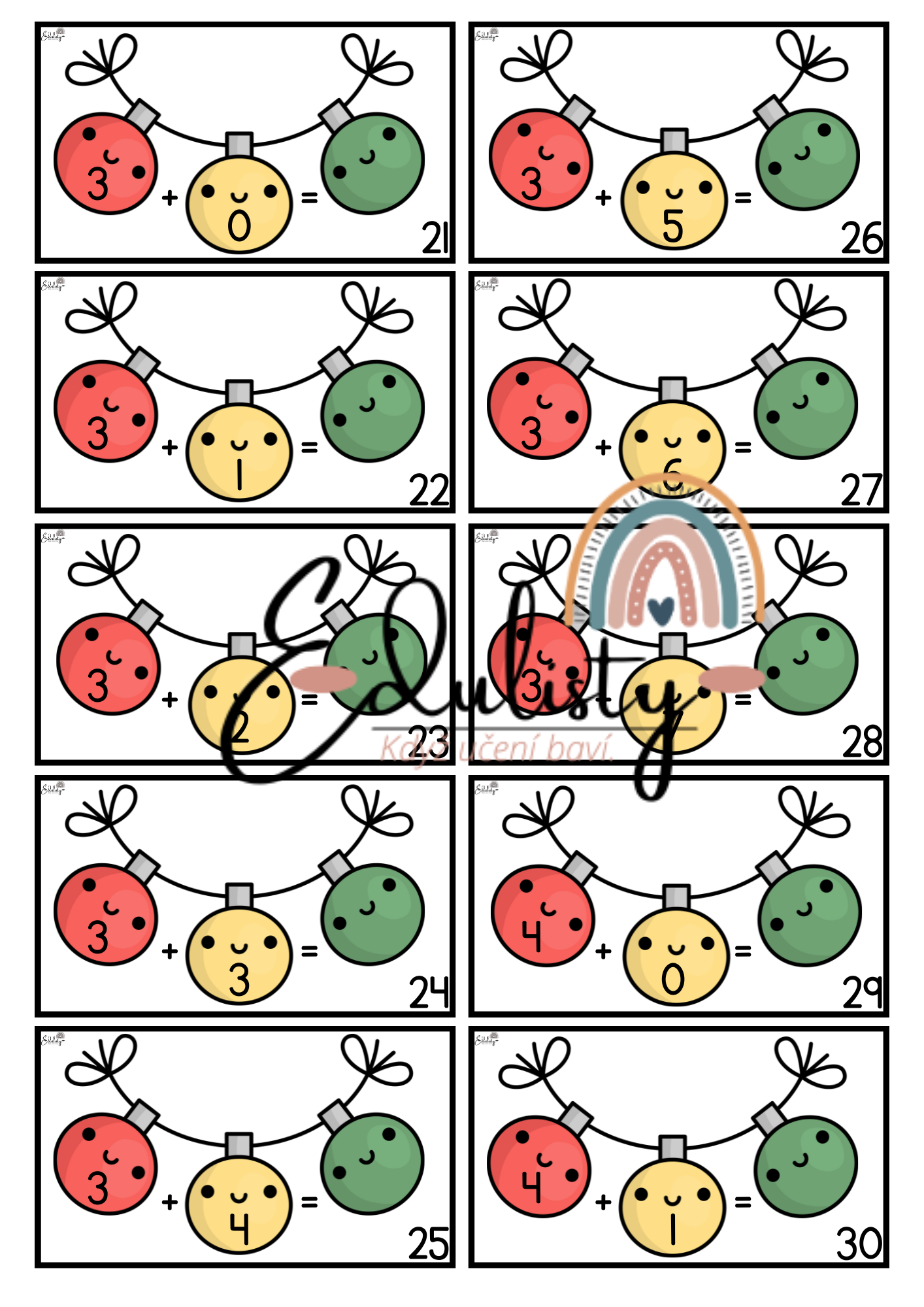 Zimní matematický set určený pro 1. ročník pomáhá dětem procvičit sčítání a odčítání do 10 hravou formou. Kartičky s příklady ve tvaru ozdob děti přiřazují ke správnému vánočnímu stromku podle výsledku, nebo mohou psát výsledek přímo na kartičku.