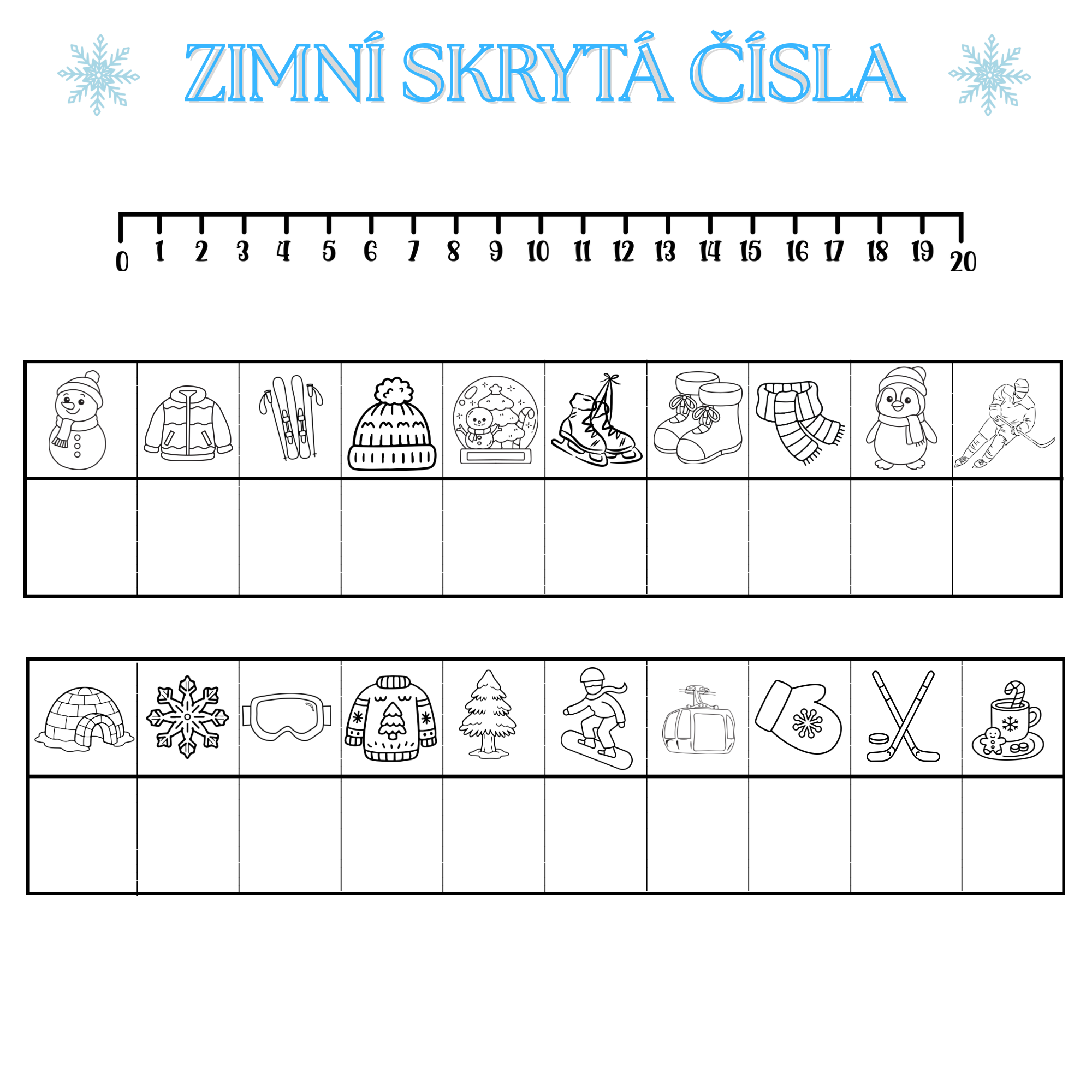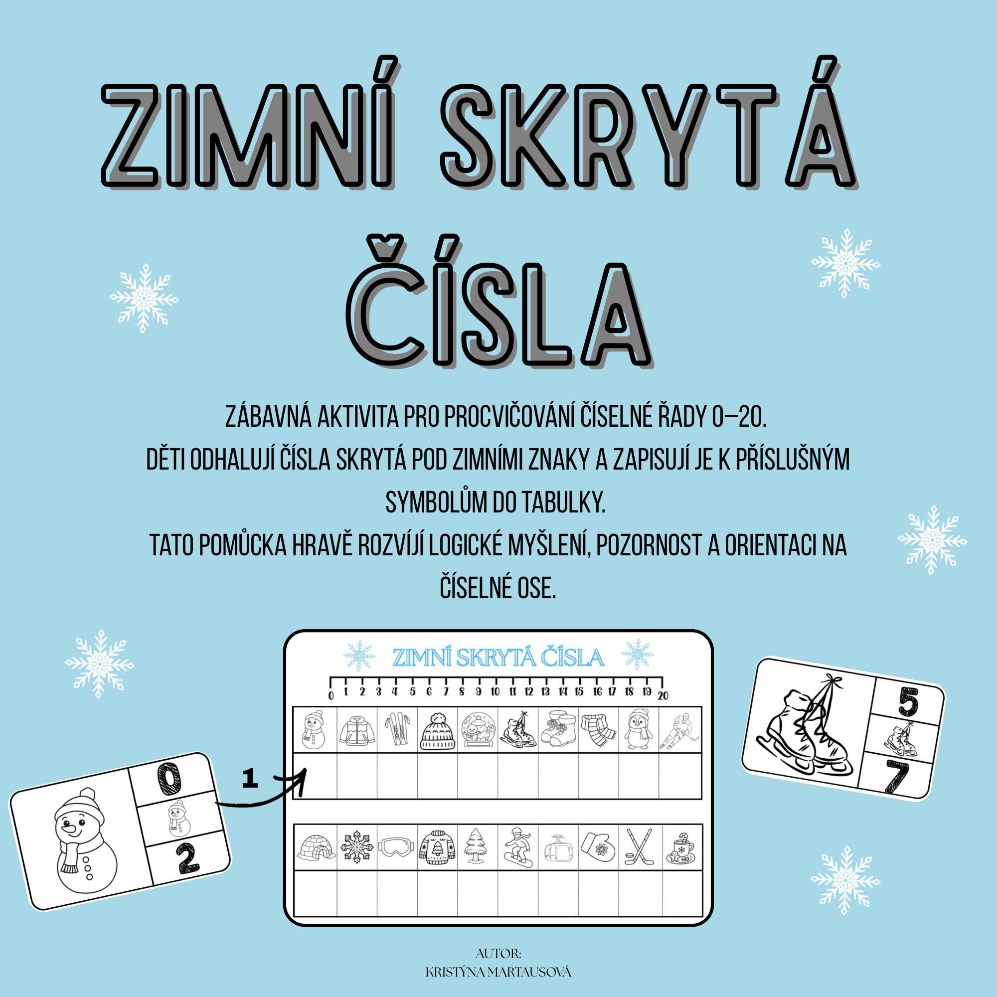 Hravá zimní aktivita zaměřená na procvičování číselné řady 0–20 a rozvoj logického myšlení. Děti se stanou malými detektivy, kteří musí zjistit, jaká čísla se schovala pod sněhovými vločkami.