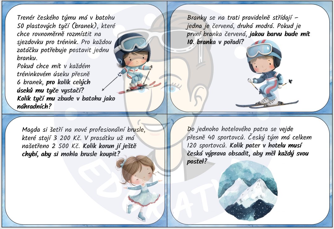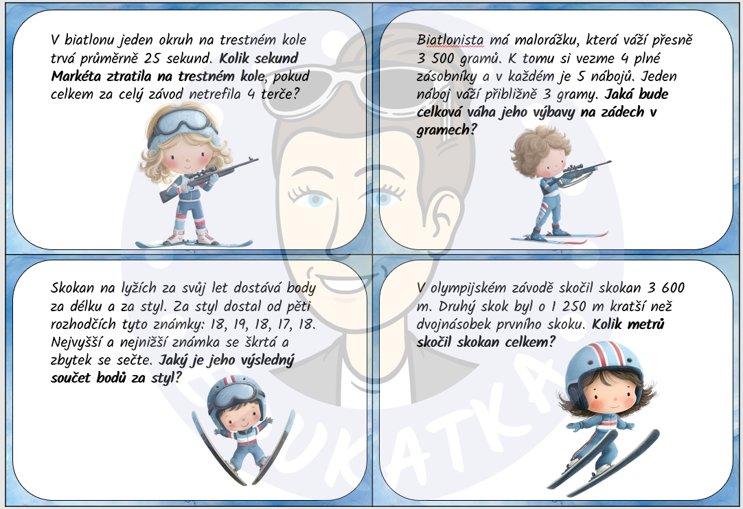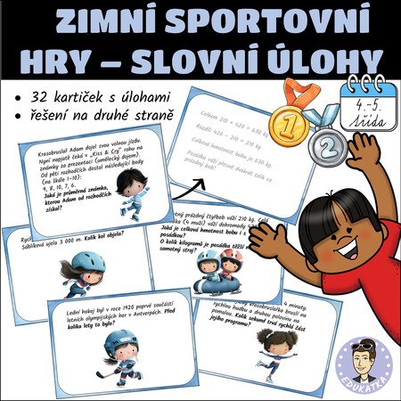 Materiál obsahuje: 32 kartiček se slovními úlohami na téma zimní sportovní hry + správné řešení + prázdná šablona pro vlastní úlohy