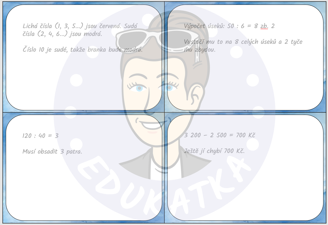 Materiál obsahuje celkem 32 kartiček s různými slovními úlohami, které slouží k procvičení učiva matematiky 4. – 5. ročníku. Pro 5. ročník je to spíše opakování. Každá kartička má z druhé strany řešení pro samokontrolu.
