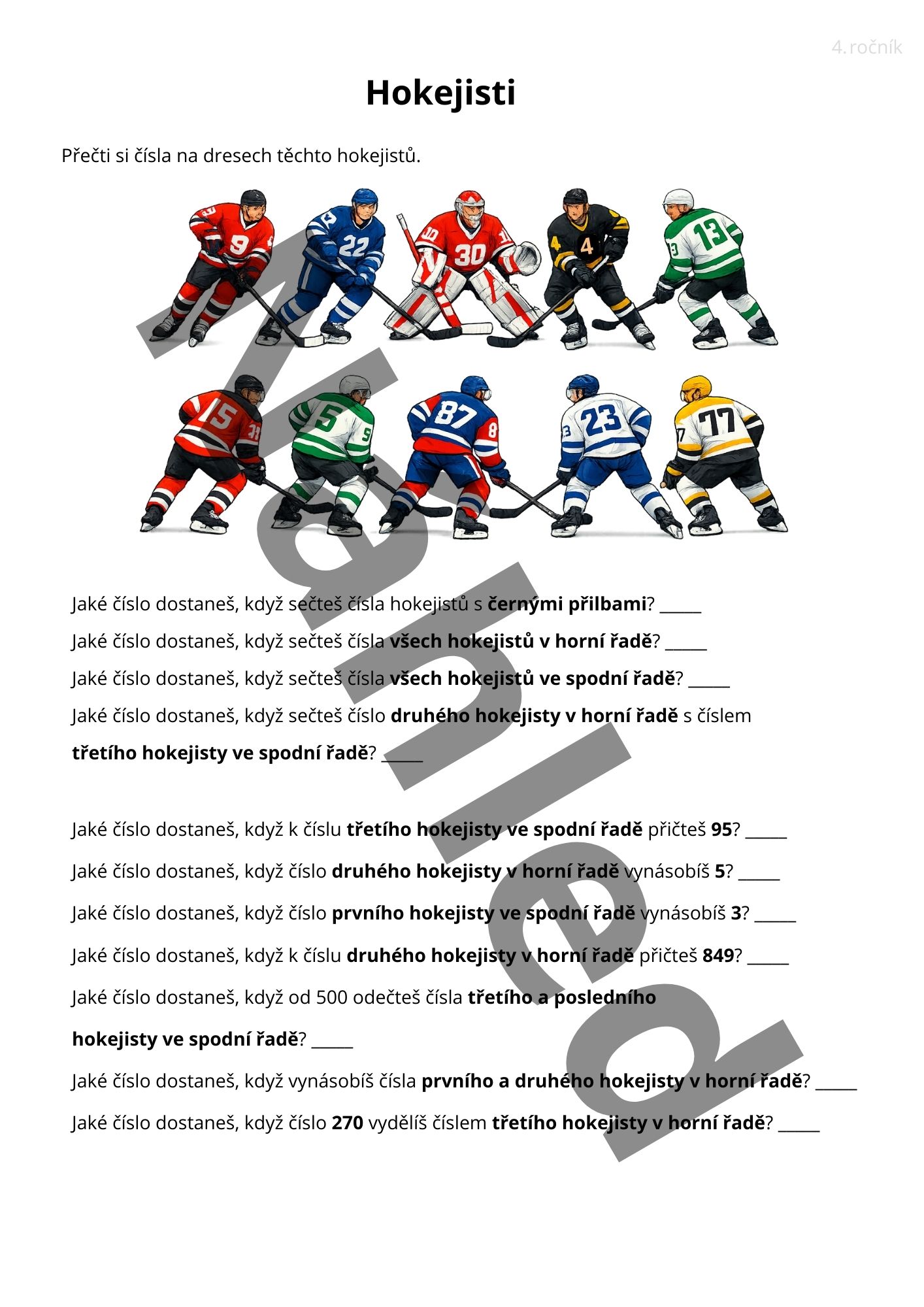 Úkoly vycházejí z obrázků hokejistů, z nichž má každý na dresu své číslo. K vyřešení úkolu je důležité správné porozumění textu. U žáků 2. ročníku doporučuji číst společně, nebo alespoň kontrolovat porozumění u těch žáků, kterým činí čtení obtíže.