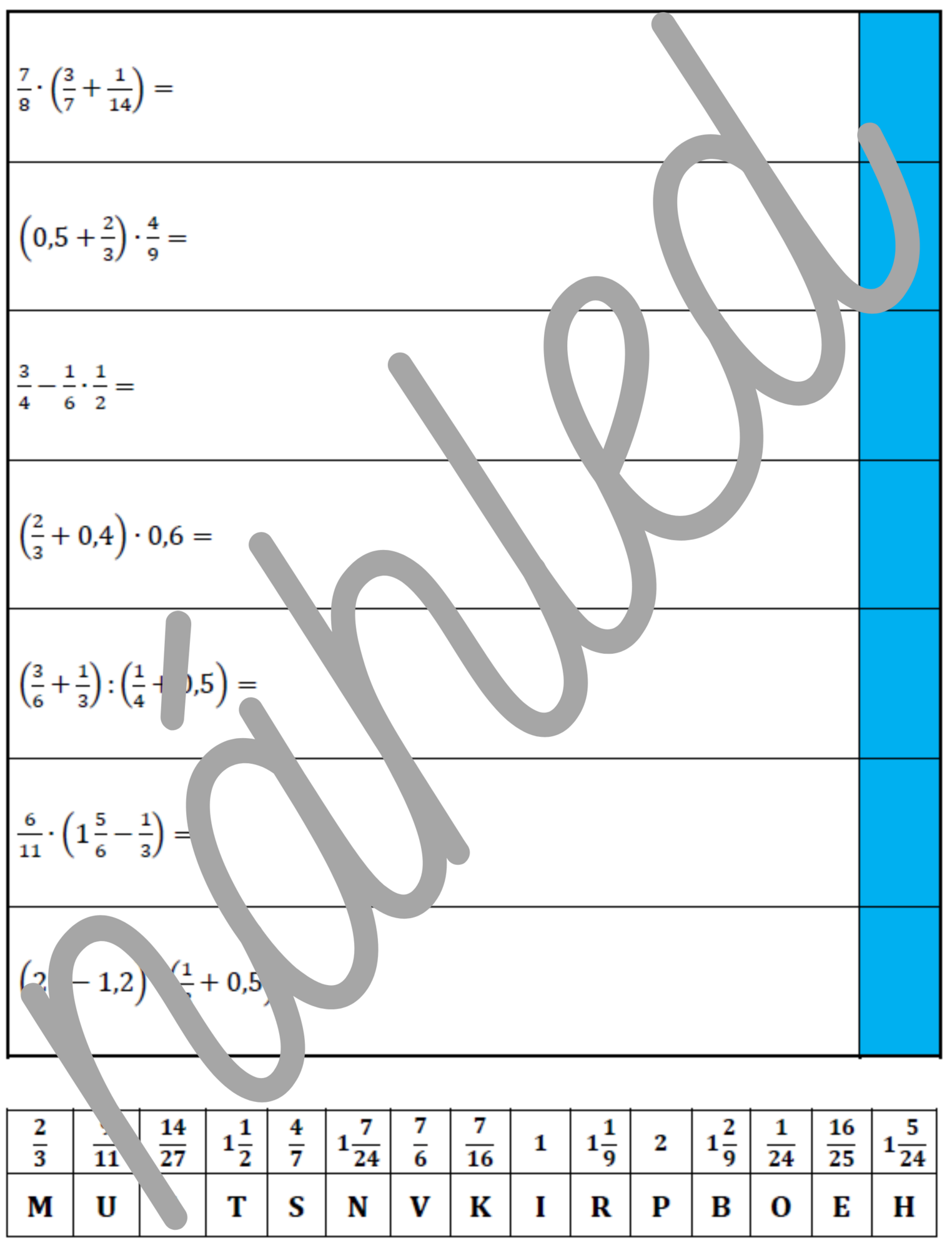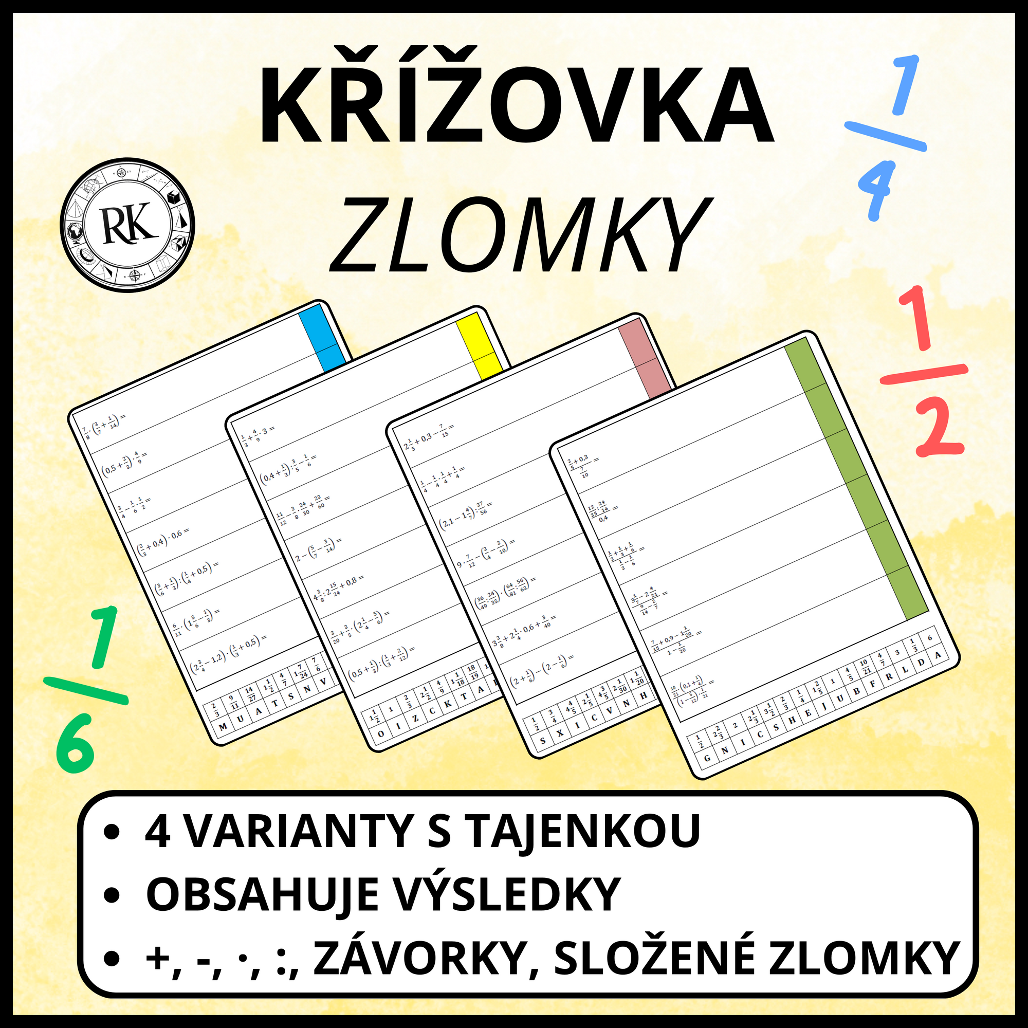 Vzdělávací materiál obsahuje 4 verze pracovních listů s křížovkami, které slouží k procvičení početních operací se zlomky (sčítání, odečítání, násobení, dělení, složené zlomky) včetně závorek. Součástí materiálu jsou správné výsledky.