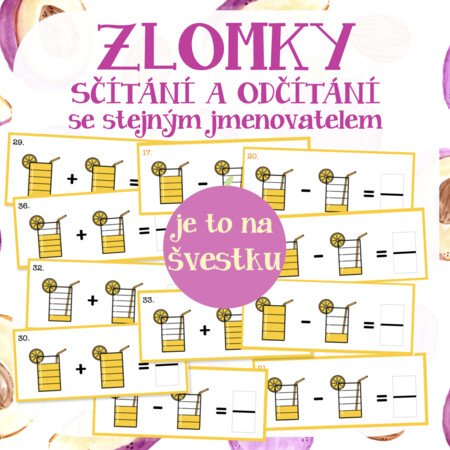 Materiál obsahuje 42 různých kartiček na sčítání a 42 kartiček na odčítání zlomků se stejným jmenovatelem. Vhodné jsou na počátky počítání se zlomky - příklady jsou lehké, názorné a jsou od 1/1 do 6/6.