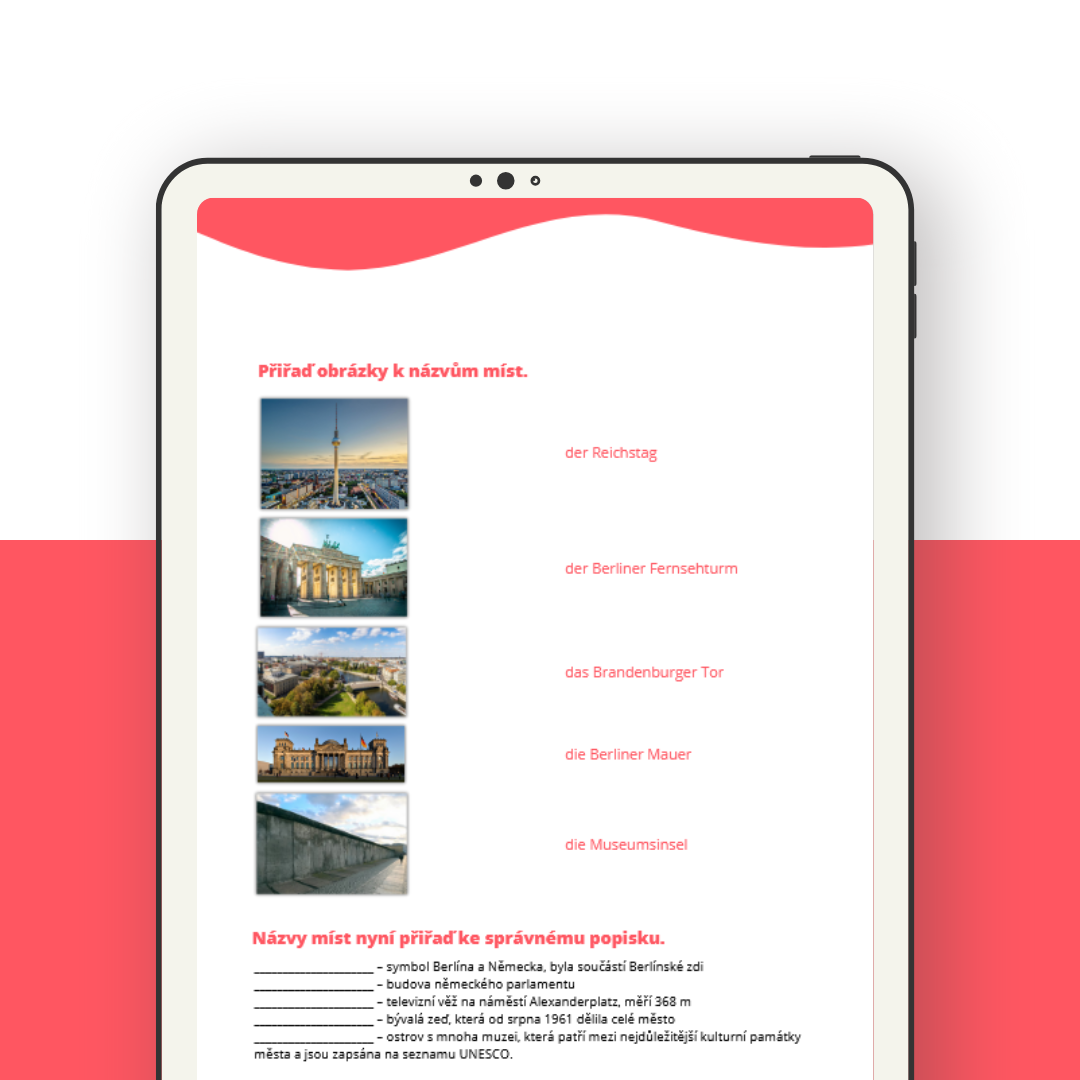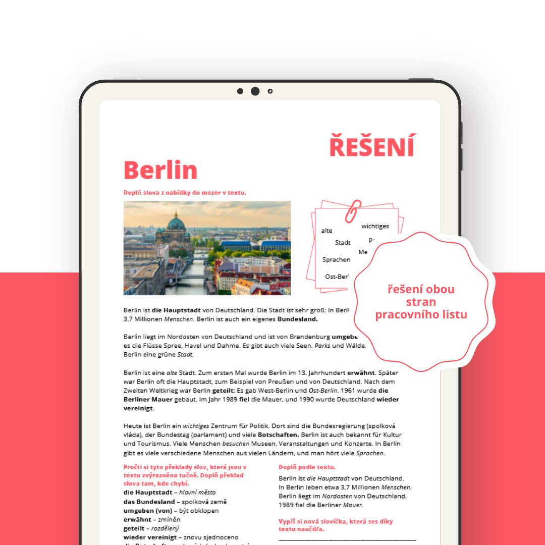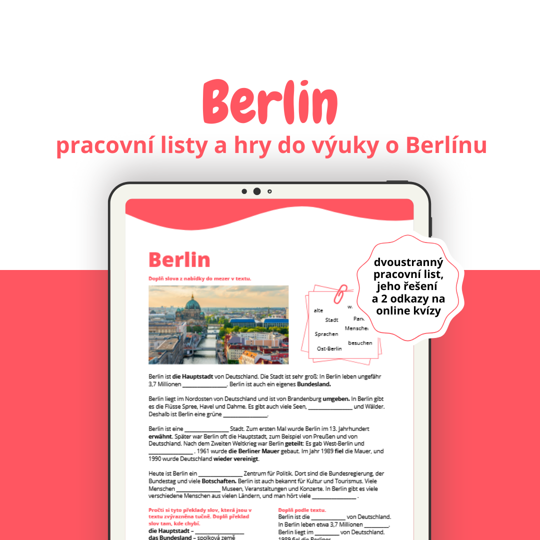 Čeká tě ve výuce výuka o německých reáliích, konkrétně o Berlínu? Využij tento dvoustránkový pracovní list a dva online kvízy k tomu. Práce zabere přibližně jednu vyučovací hodinu.