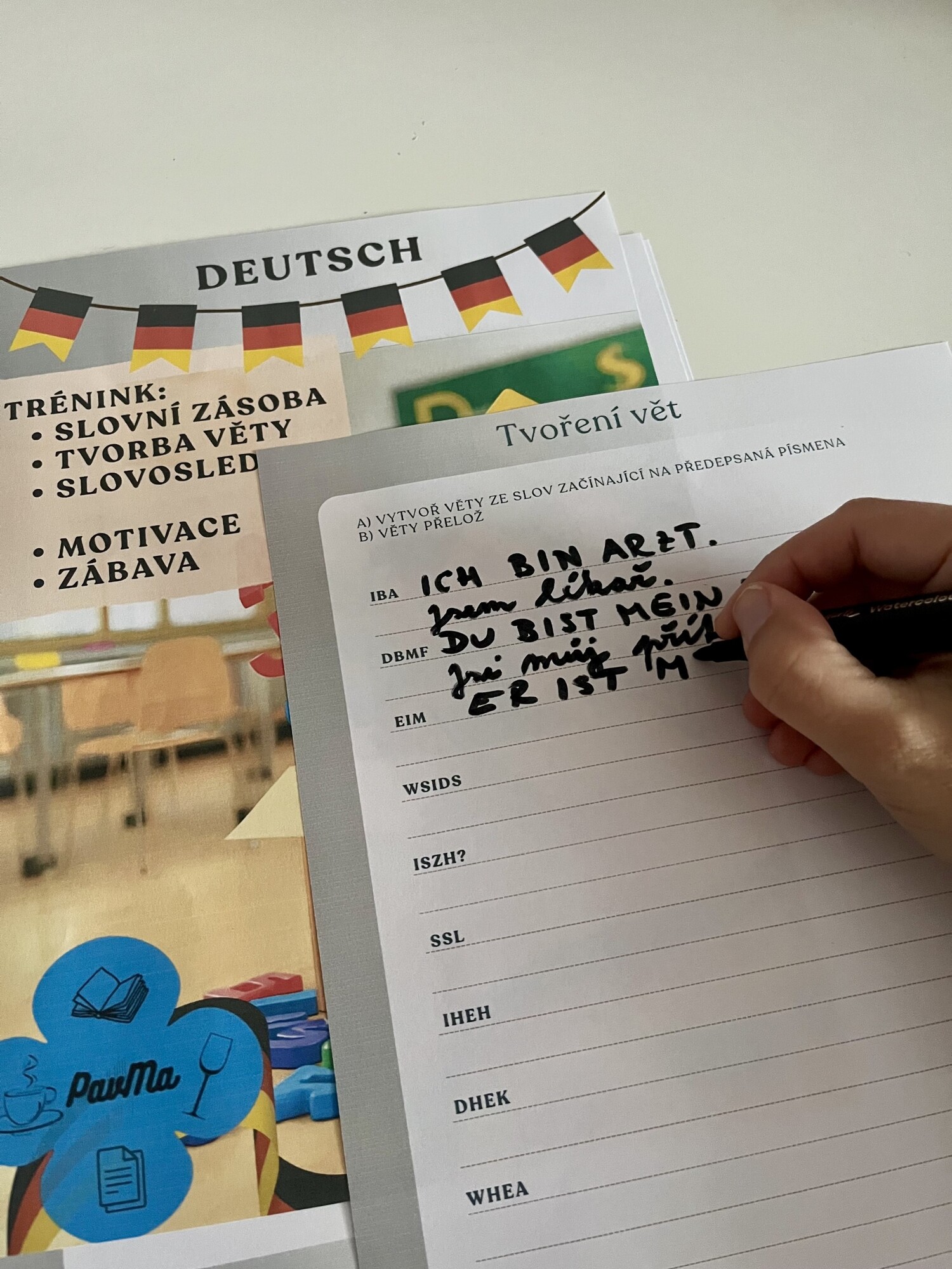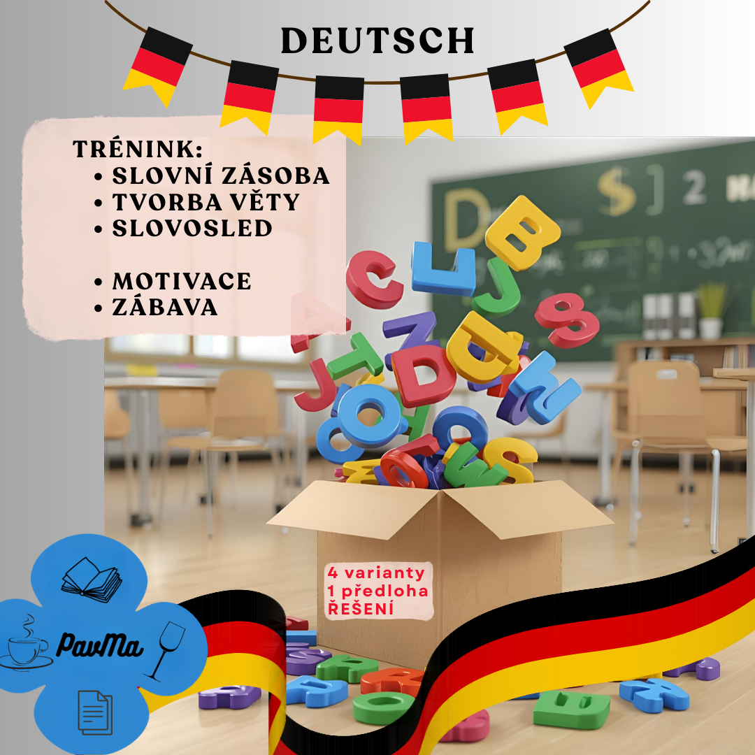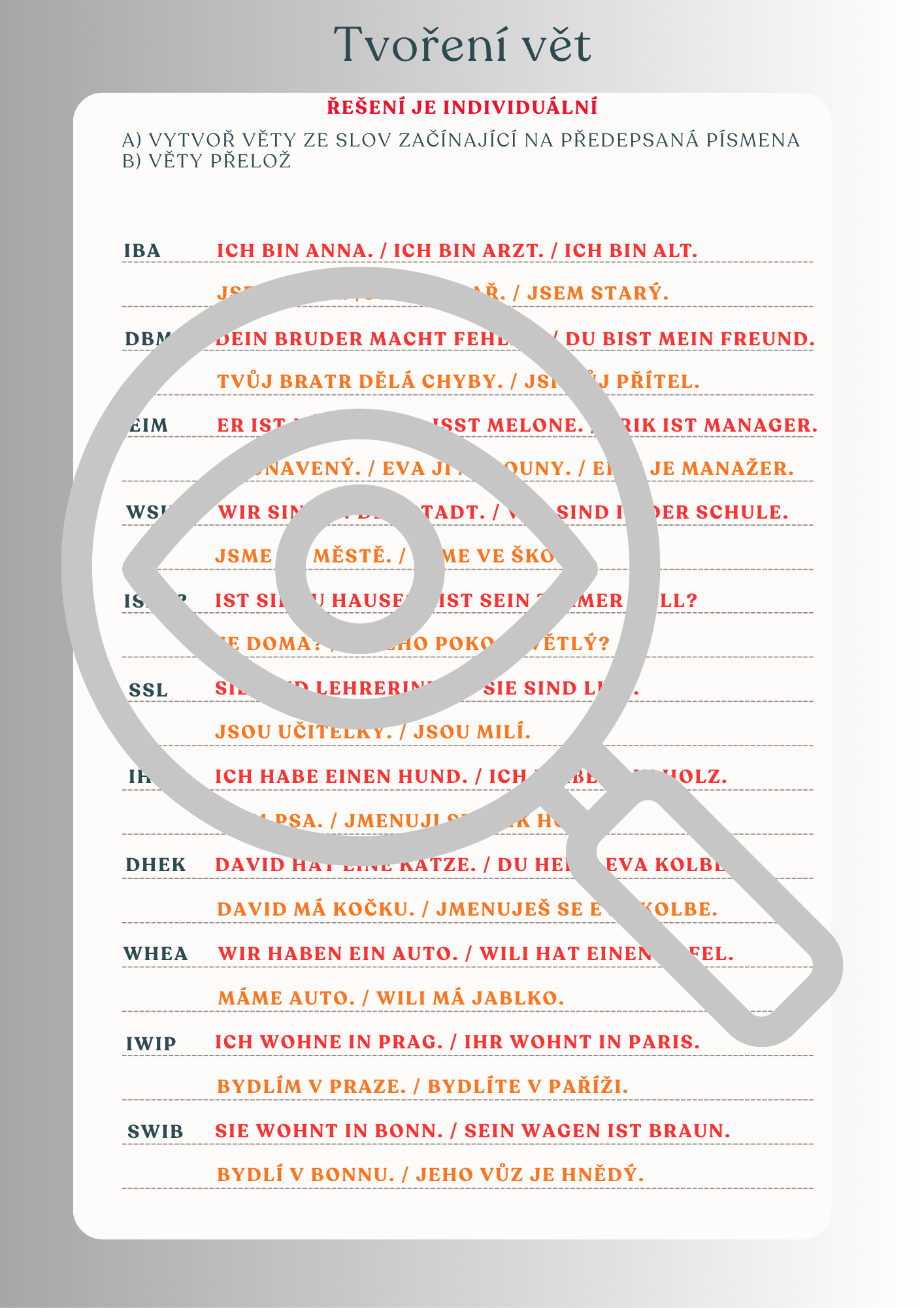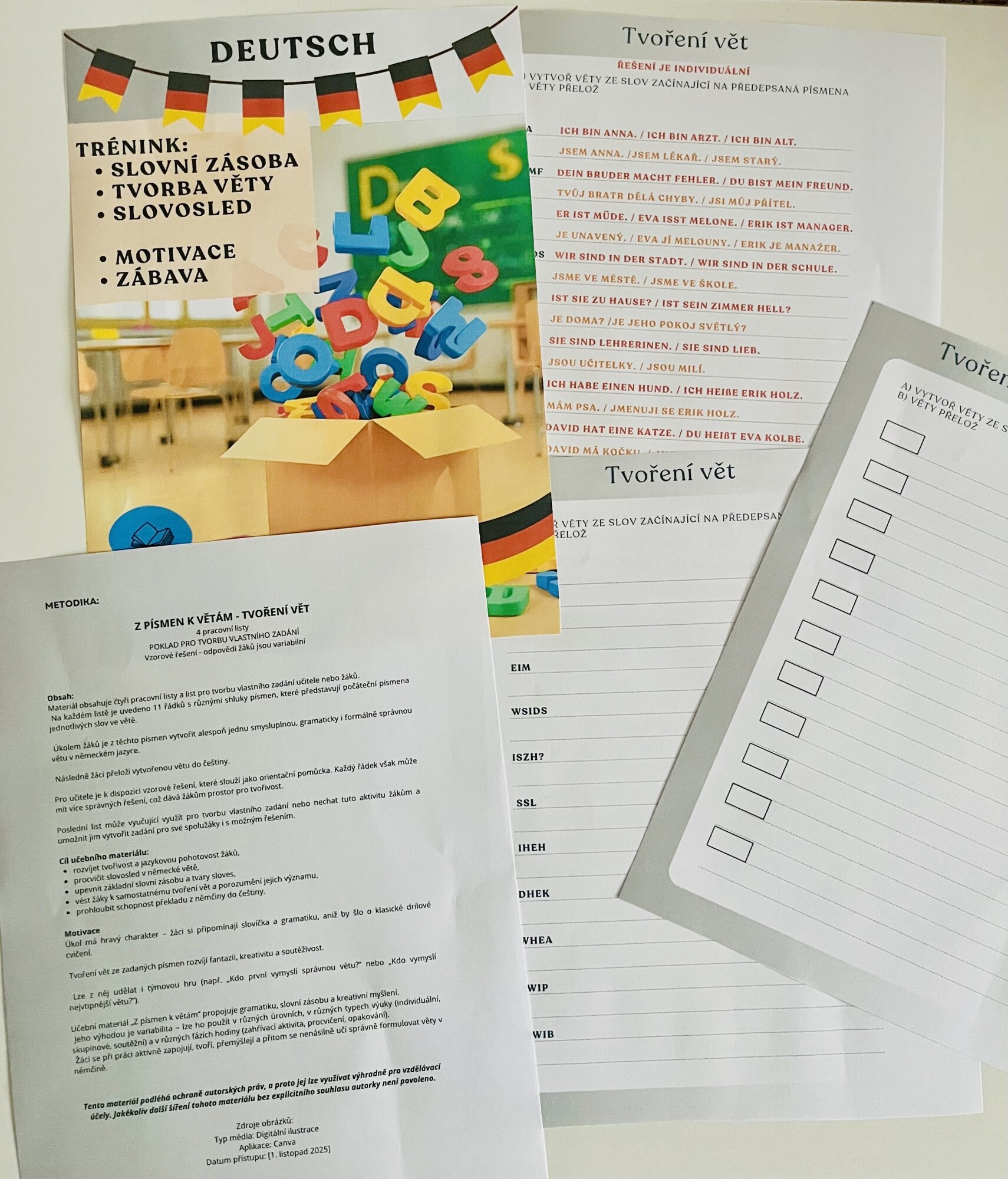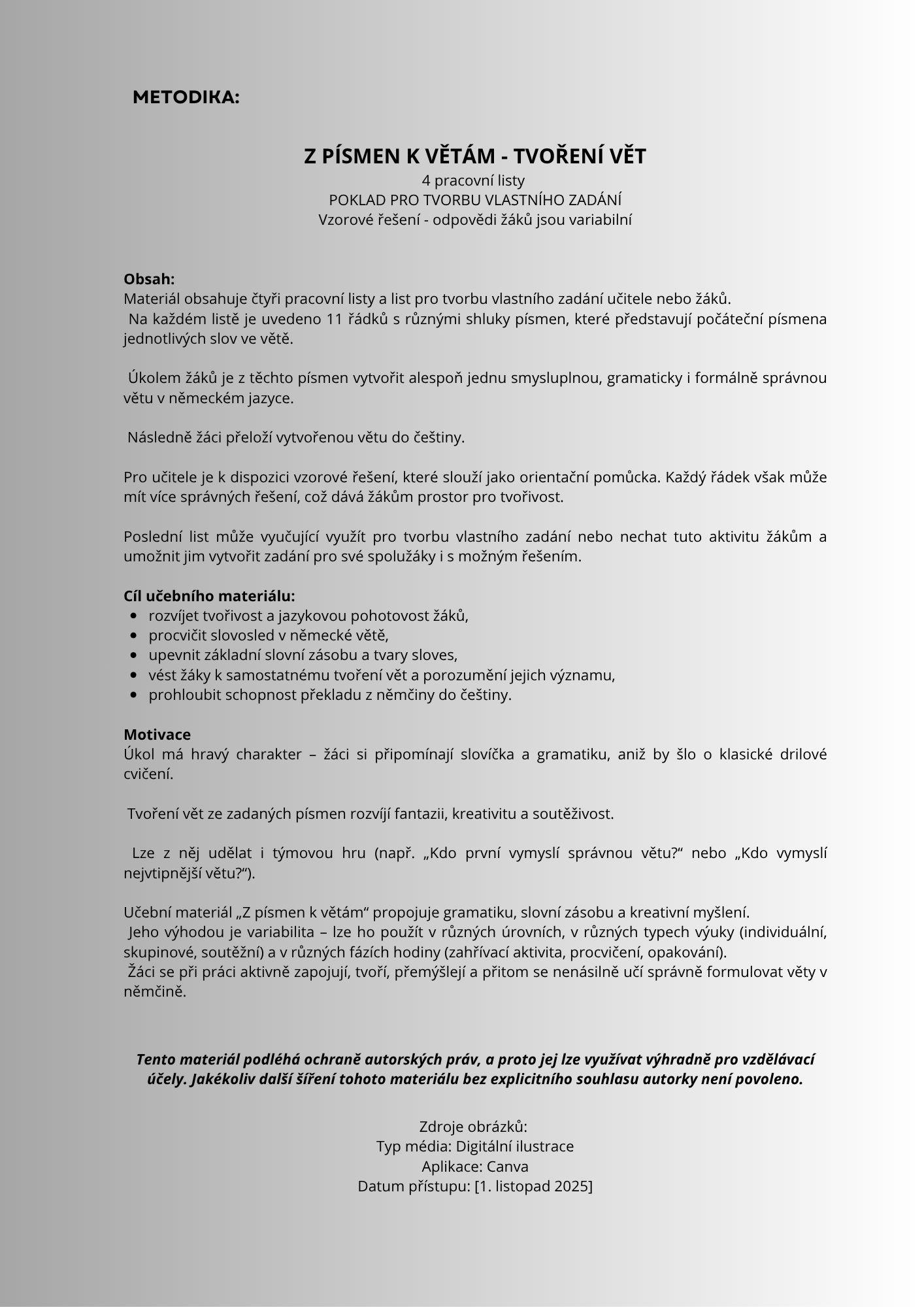 Úkolem žáků je z těchto písmen vytvořit alespoň jednu smysluplnou, gramaticky i formálně správnou větu v německém jazyce.
