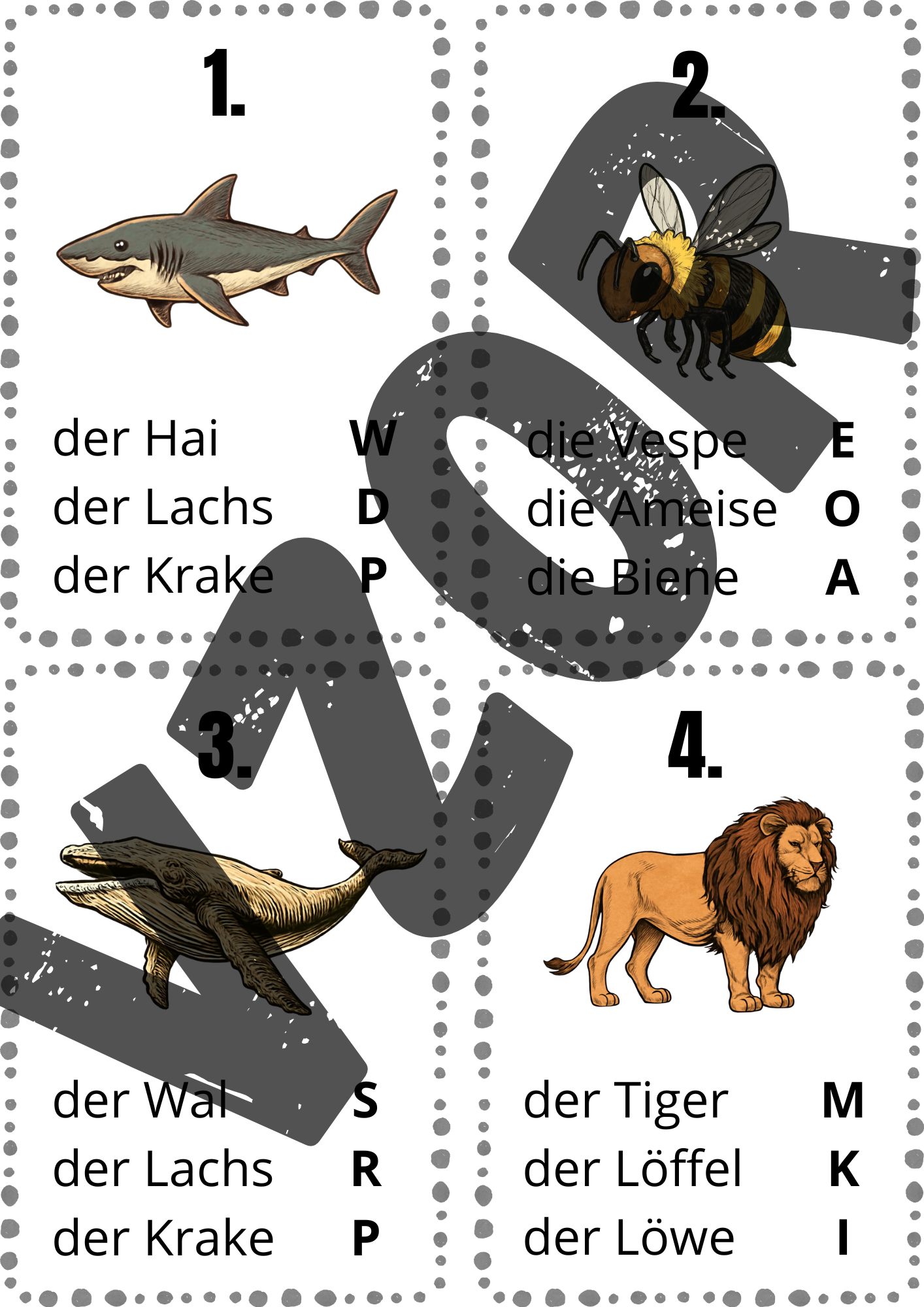 Učitel rozvěsí na chodbě, ve třídě nebo venku obrázky s třemi možnostmi německého překladu. Žáci chodí s pracovním listem, pojmenovávají zvířata na kartičkách a zapisují k danému číslu písmenko, které odpovídá správné odpovědi. Na konci hry pak sestaví tajenku.