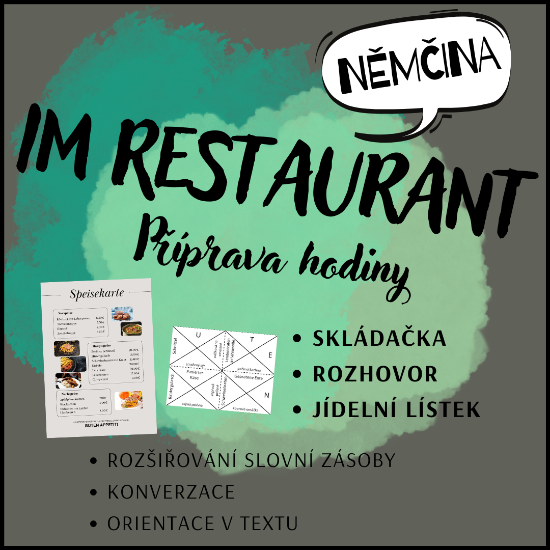 Příprava hodiny Im Restaurant je zaměřena na rozšiřování slovní zásoby, orientaci v textu a konverzaci. Žáci si osvojí názvy českých tradičních jídel v němčině a seznámí se s některými německými národními pokrmy. Kromě toho se naučí také užitečné fráze.