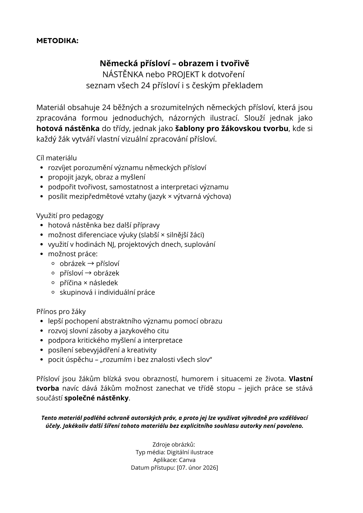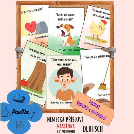 Materiál obsahuje 24 běžných a srozumitelných německých přísloví, která jsou zpracována formou jednoduchých, názorných ilustrací. Slouží jednak jako hotová nástěnka do třídy, jednak jako šablony pro žákovskou tvorbu, kde si každý žák vytváří vlastní vizuální zpracování přísloví.