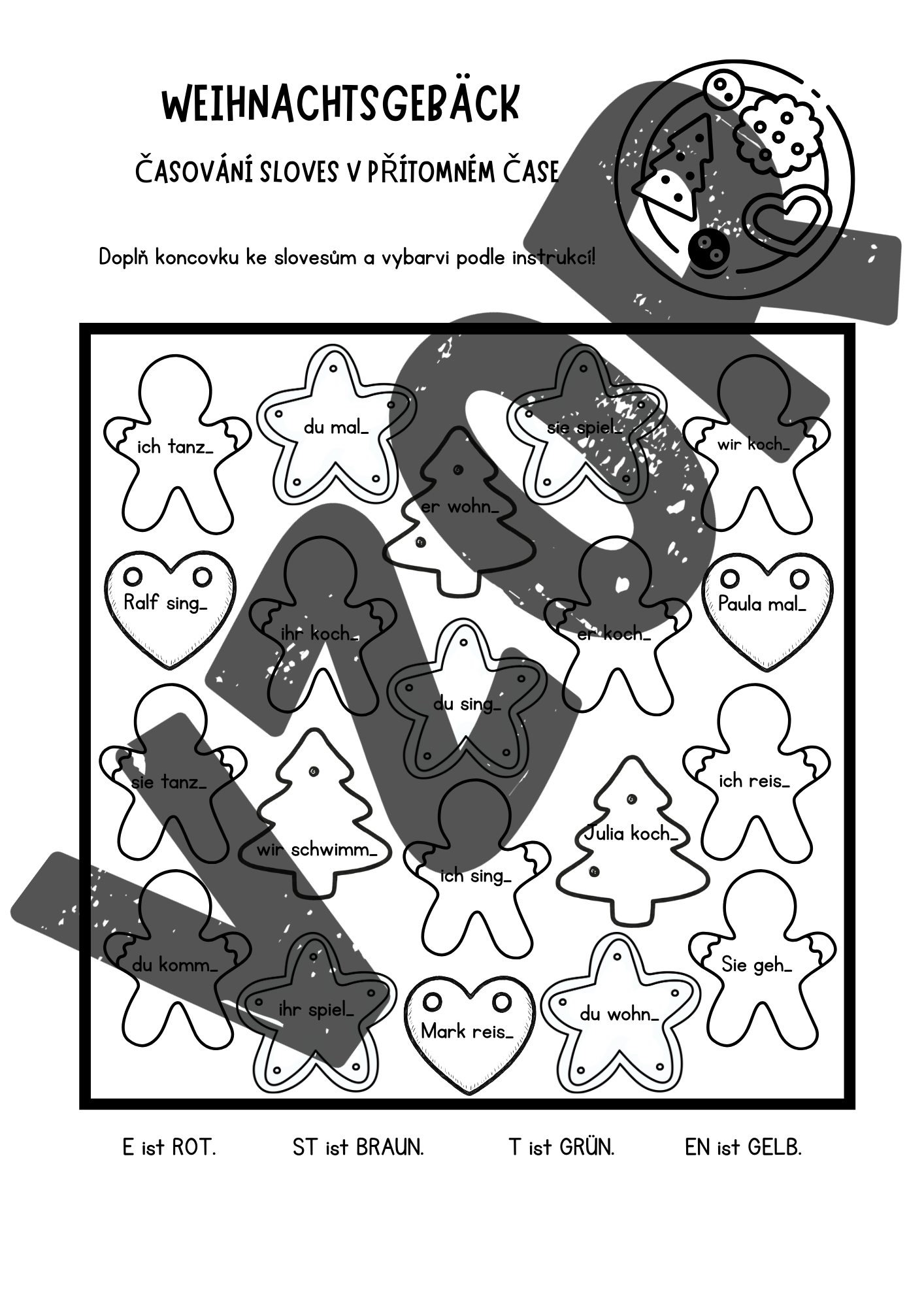 časování sloves v přítomném čase - žáci nejprve doplňují koncovky sloves, poté vybarvují příslušnou barvou podle doplněné koncovky