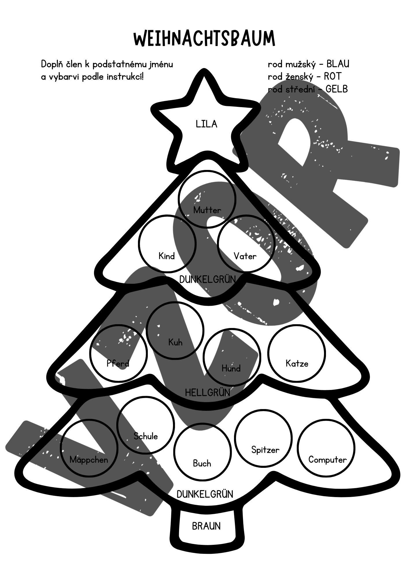 členy podstatných jmen – žáci nejprve doplňují členy k podstatným jménům, poté vybarvují příslušnou barvou podle rodu
