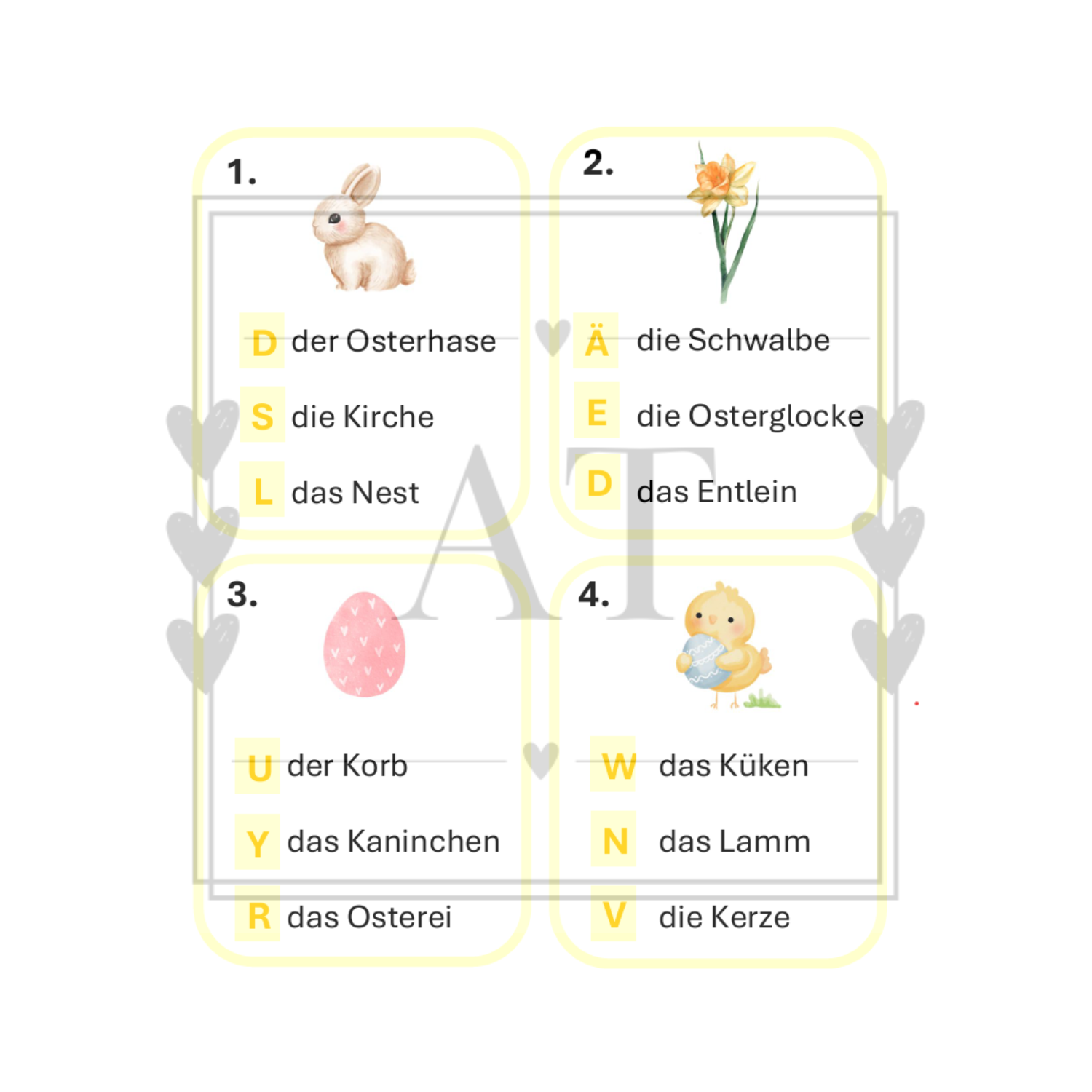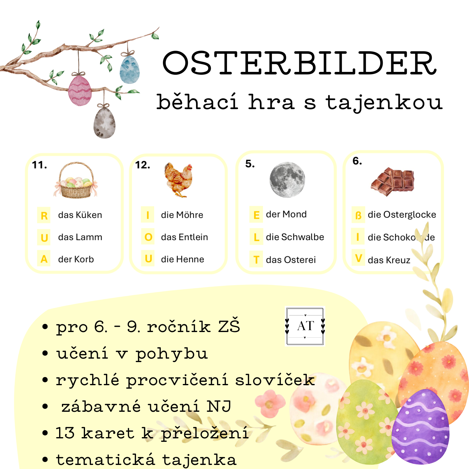 Oblíbená běhací hra do hodiny němčiny. Soubor obsahuje 13 karet + list k zapsání tajenky. Každá karta obsahuje obrázek týkající se Velikonoc + 3 možnosti německého překladu. Do tajenky žáci napíší písmeno, které je uvedeno u správného německého překladu. Součástí je také kontrolní list. Ideální k rychlému procvičení probíraného učiva nebo jako motivace na začátek vyučovací hodiny.