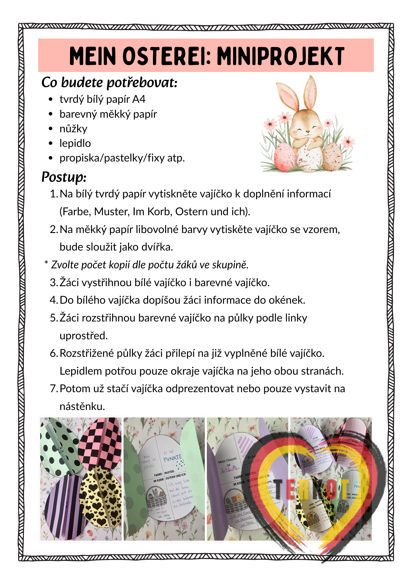 Najdete zde pracovní listy, které se zaměřují na velikonoční slovní zásobu a zároveň připravují na velikonoční miniprojekt Mein Osterei, který je na konci balíčku včetně návodu. Celkově miniprojekt zabere asi jednu vyučovací hodinu, co se tvorby týče, a pokud byste chtěli se žáky i prezentovat, tak vám to zabere dvě vyučovací hodiny. Pracovní listy mohou být využity buď v rámci miniprojektu nebo nezávisle na něm kdykoliv ve vyučování.