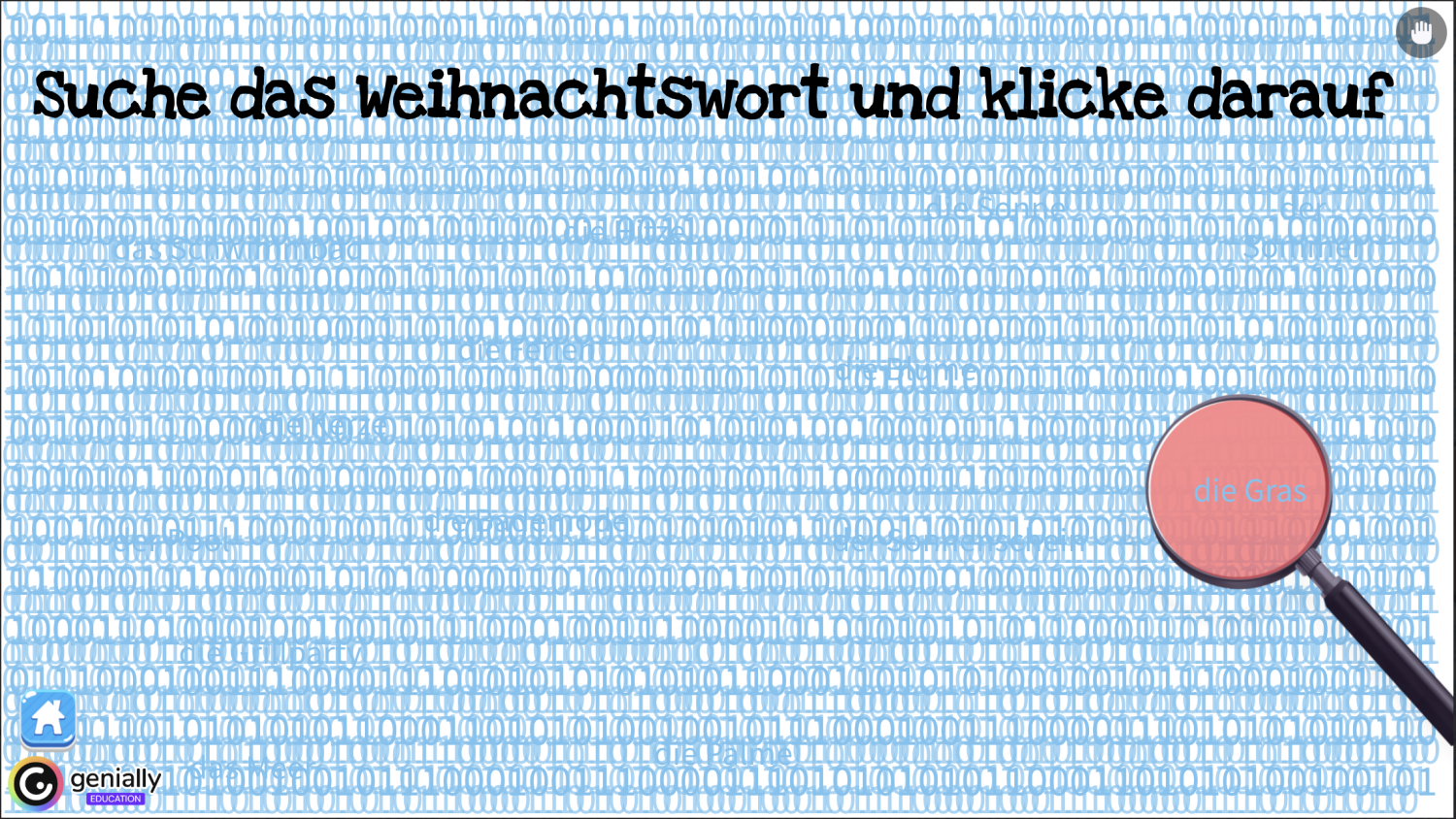 4 obrázky obsahující různá nahodilá slova. Pouze jedno slovo je spojené s Vánocemi. Žák pohybuje lupou a hledá toto slovo. Když ho najde, kliknutím na něj se posouvá na další úkol.