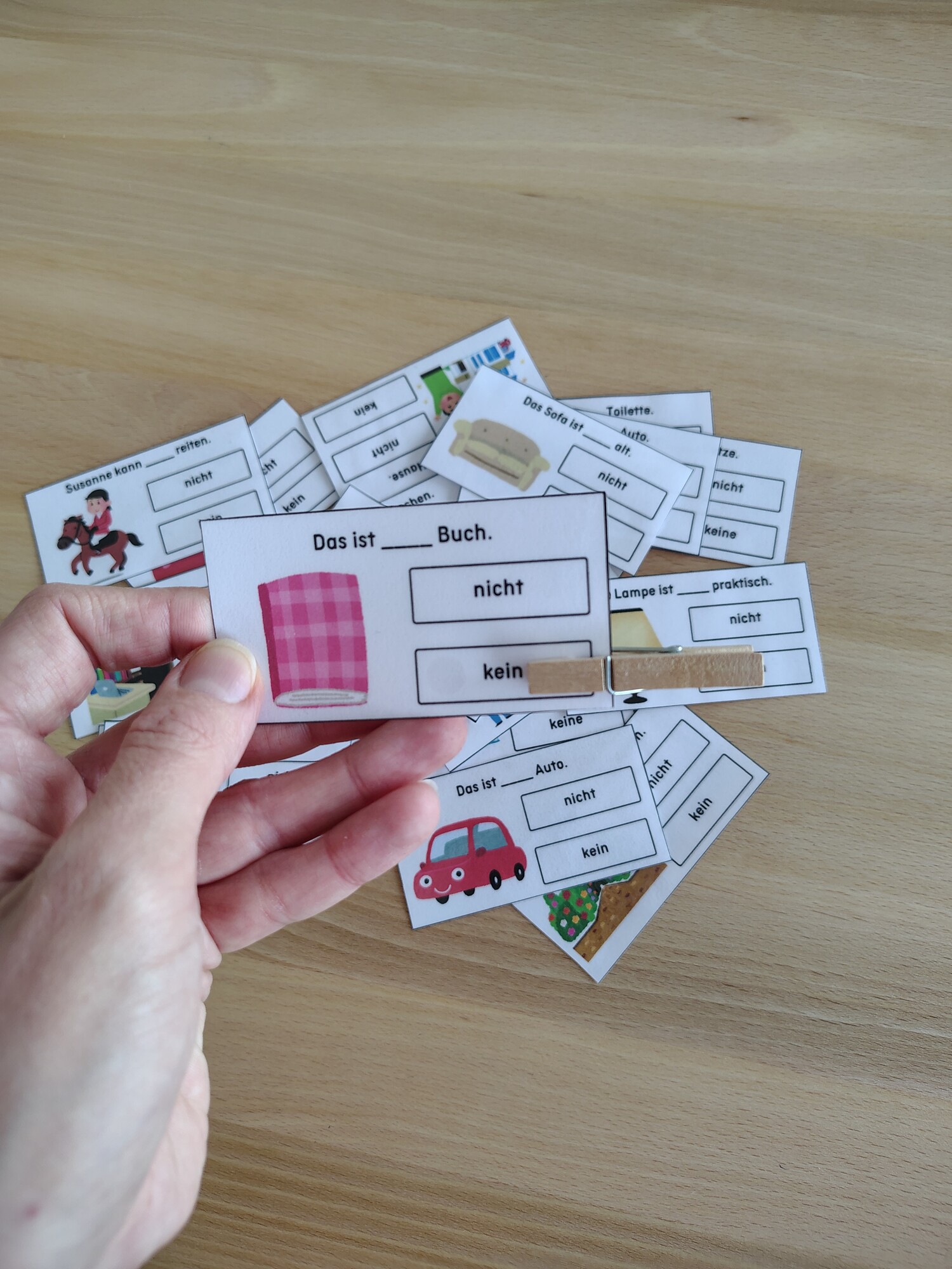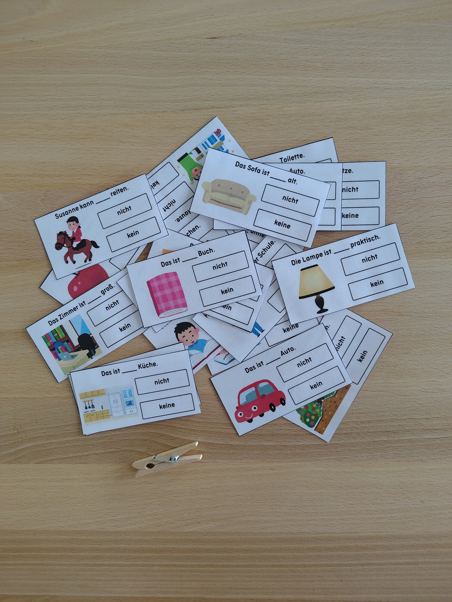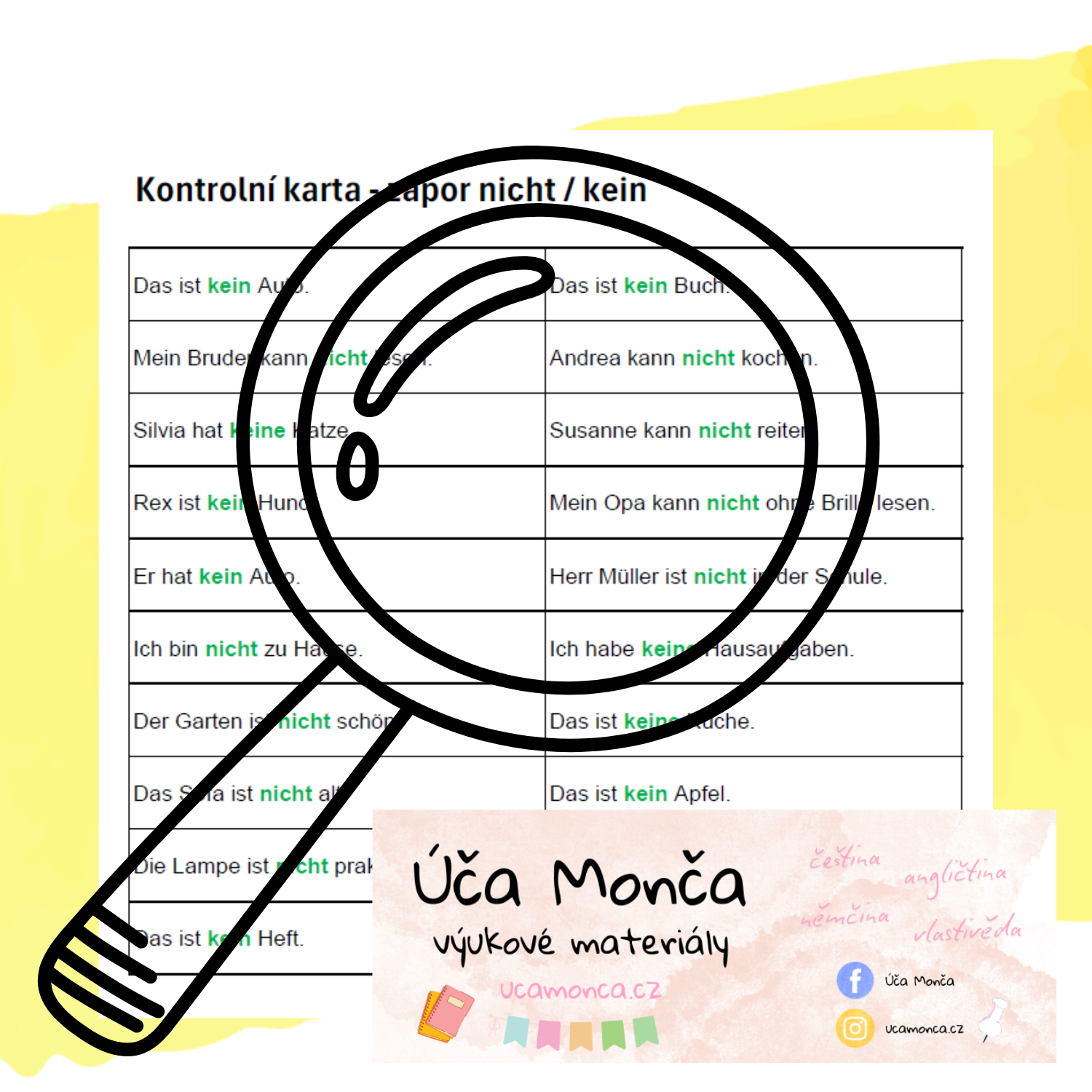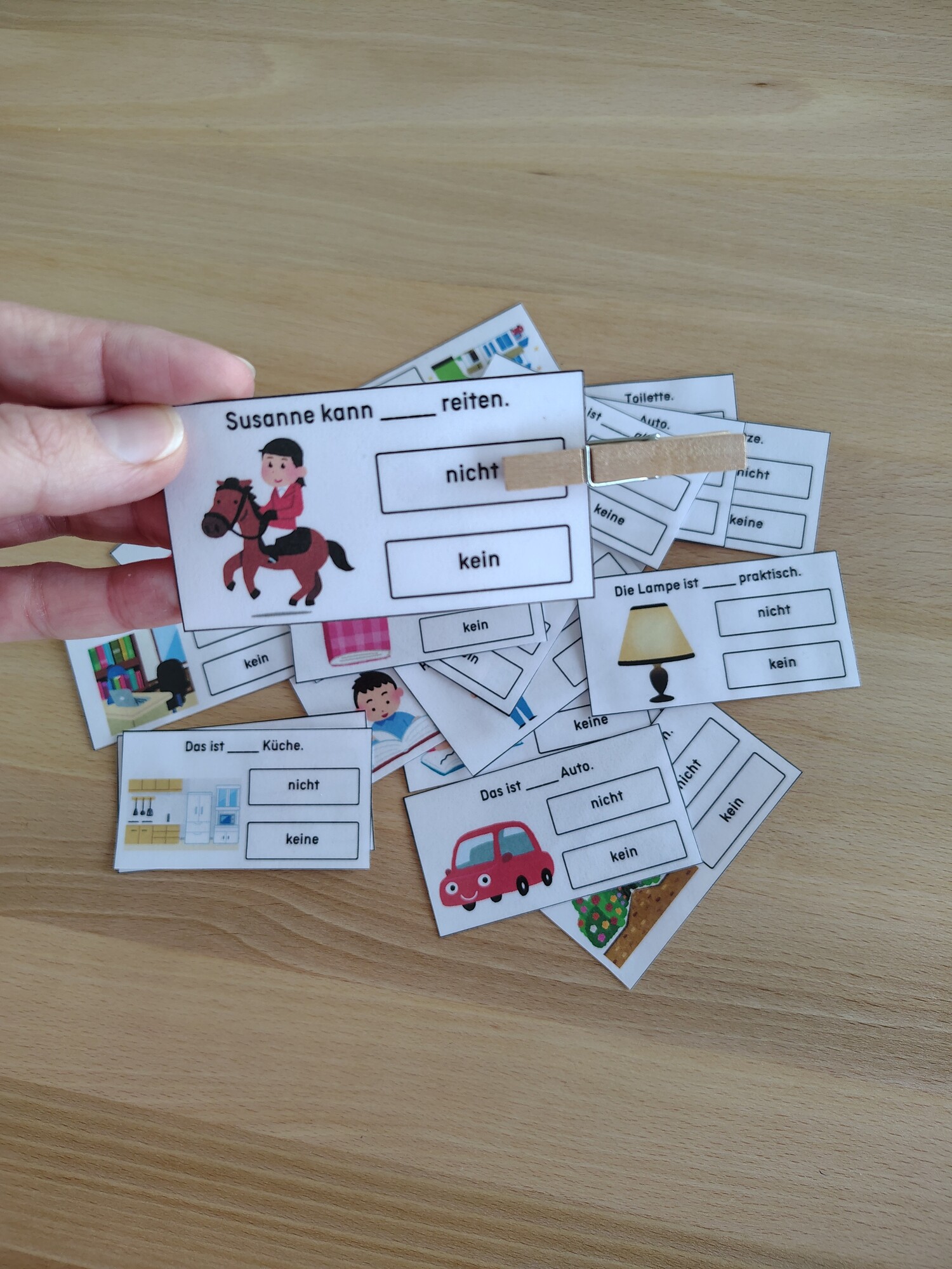 Pomůcka je určena do výuky německého jazyka. Žáci procvičují zápor nicht a kein.
