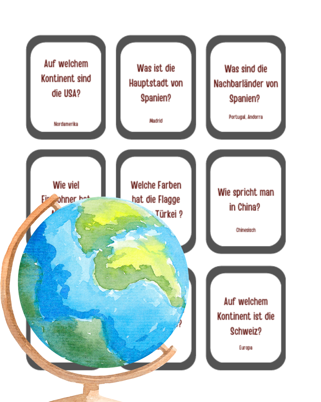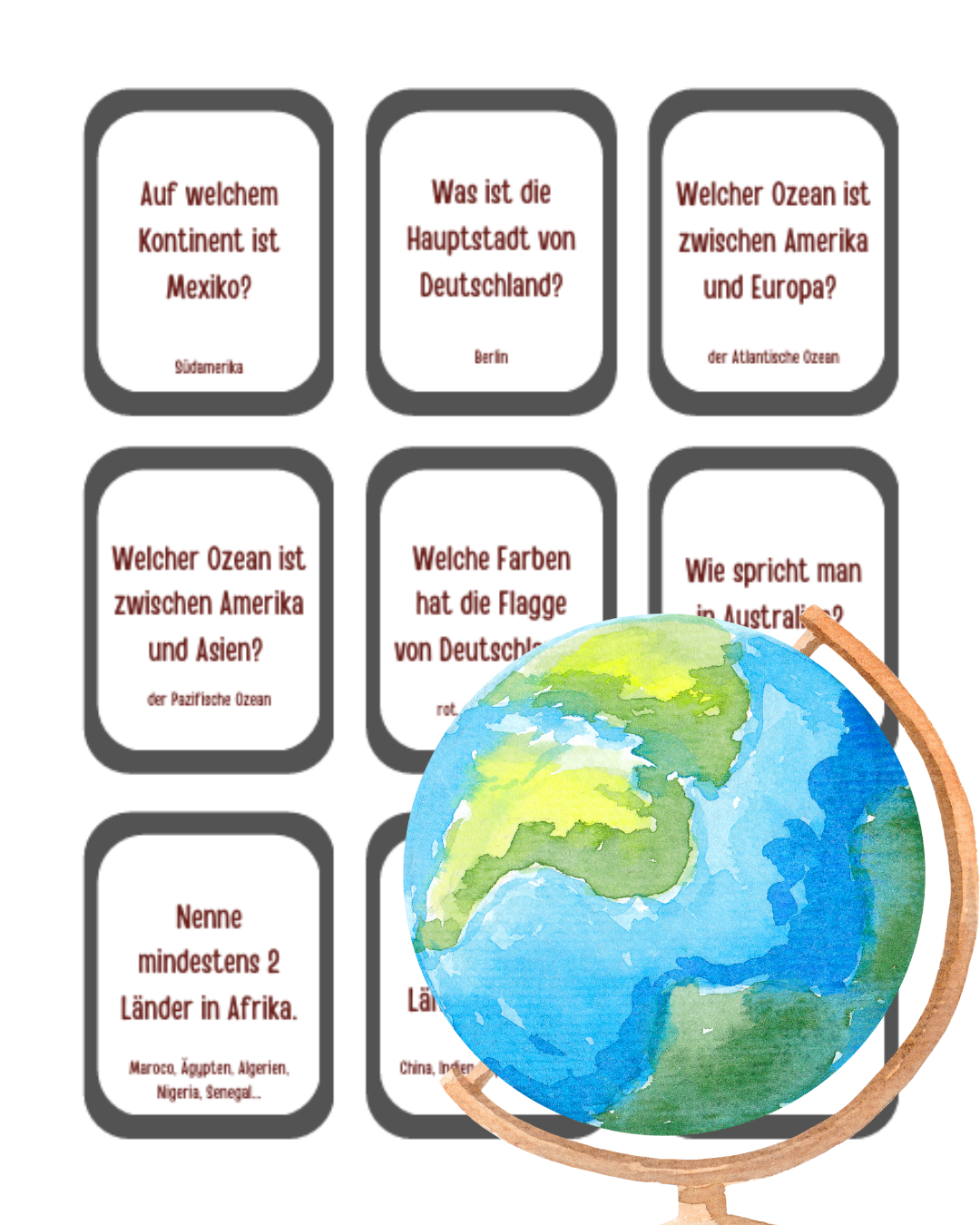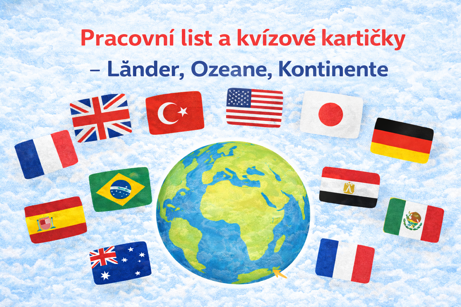 Pracovní listy k výuce němčiny na téma národnosti, kontinenty a oceány. Materiál obsahuje také 36 kvízových karet s odpovědmi, které slouží k procvičení vybraných států, kontinentů, dále také zeměpisných znalostí a barev.