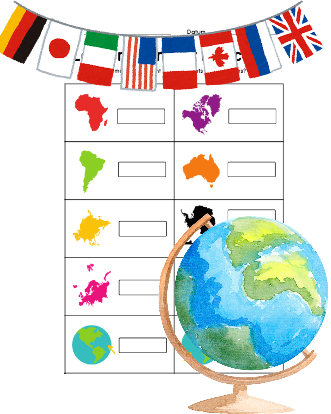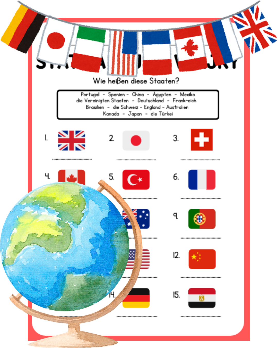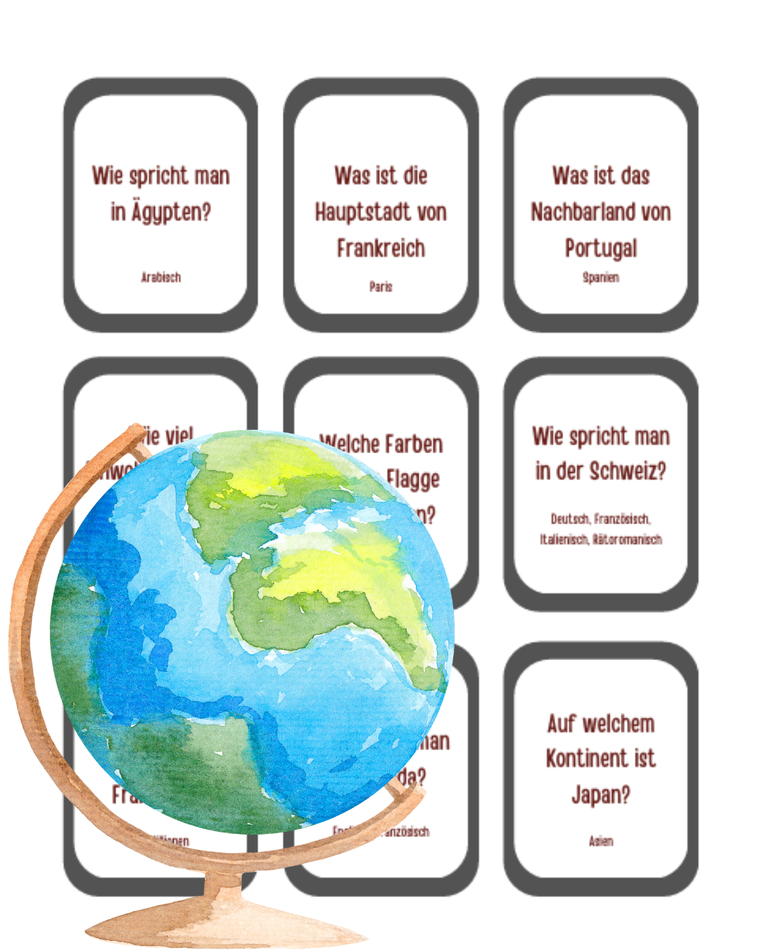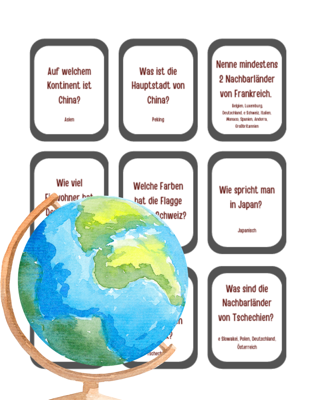 Pracovní listy k výuce němčiny na téma národnosti, kontinenty a oceány. Materiál obsahuje také 36 kvízových karet s odpovědmi, které slouží k procvičení vybraných států, kontinentů, dále také zeměpisných znalostí a barev.